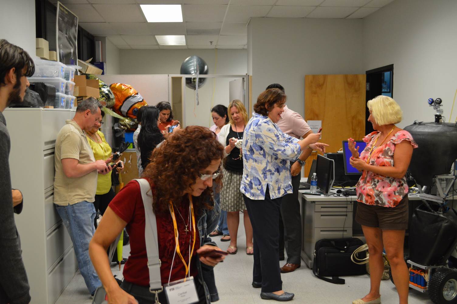 As part of the Tapestry Workshop hosted at FIU, the attendees received a tour of the Discovery Lab. The high school teachers were able to see a quick demonstration of some of the prototypes here as well as a full explanation of most of the projects. The participants recorded video of the machines and some even took pictures with the Telebot prototype. The atendees were most impressed with the air Aquarium project and the Telebot for their size and capabilities. Although it was a quick presentation, the participants were able to learn much about the Discovery Lab’s work here at FIU.