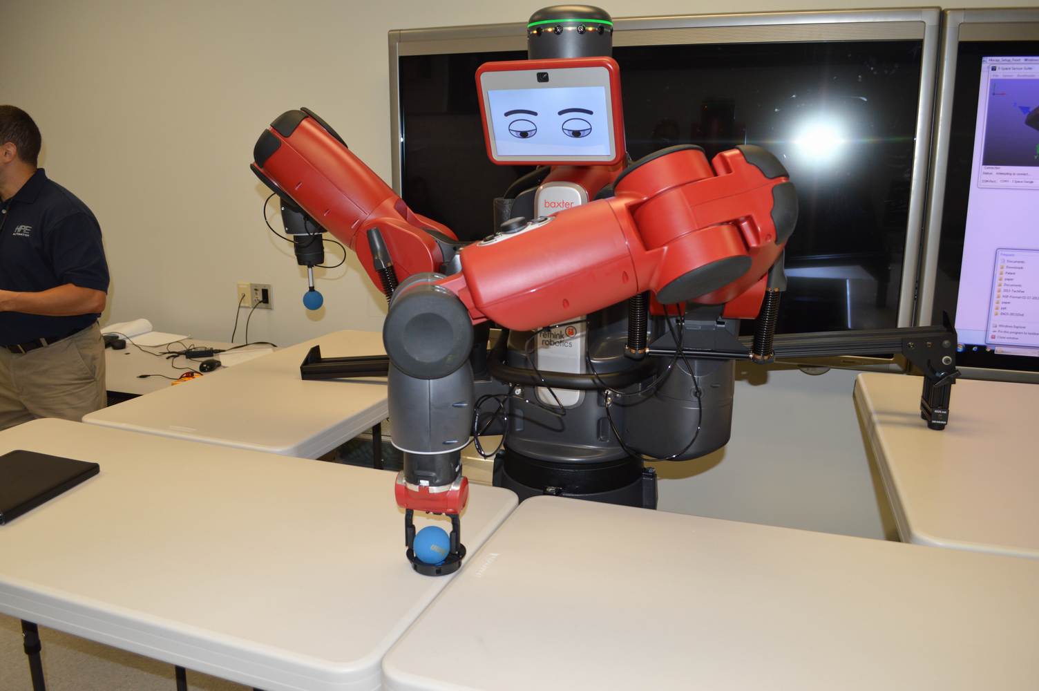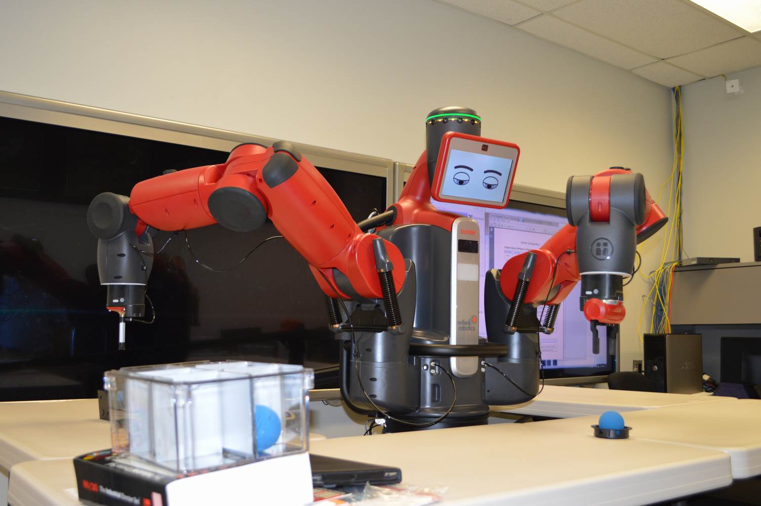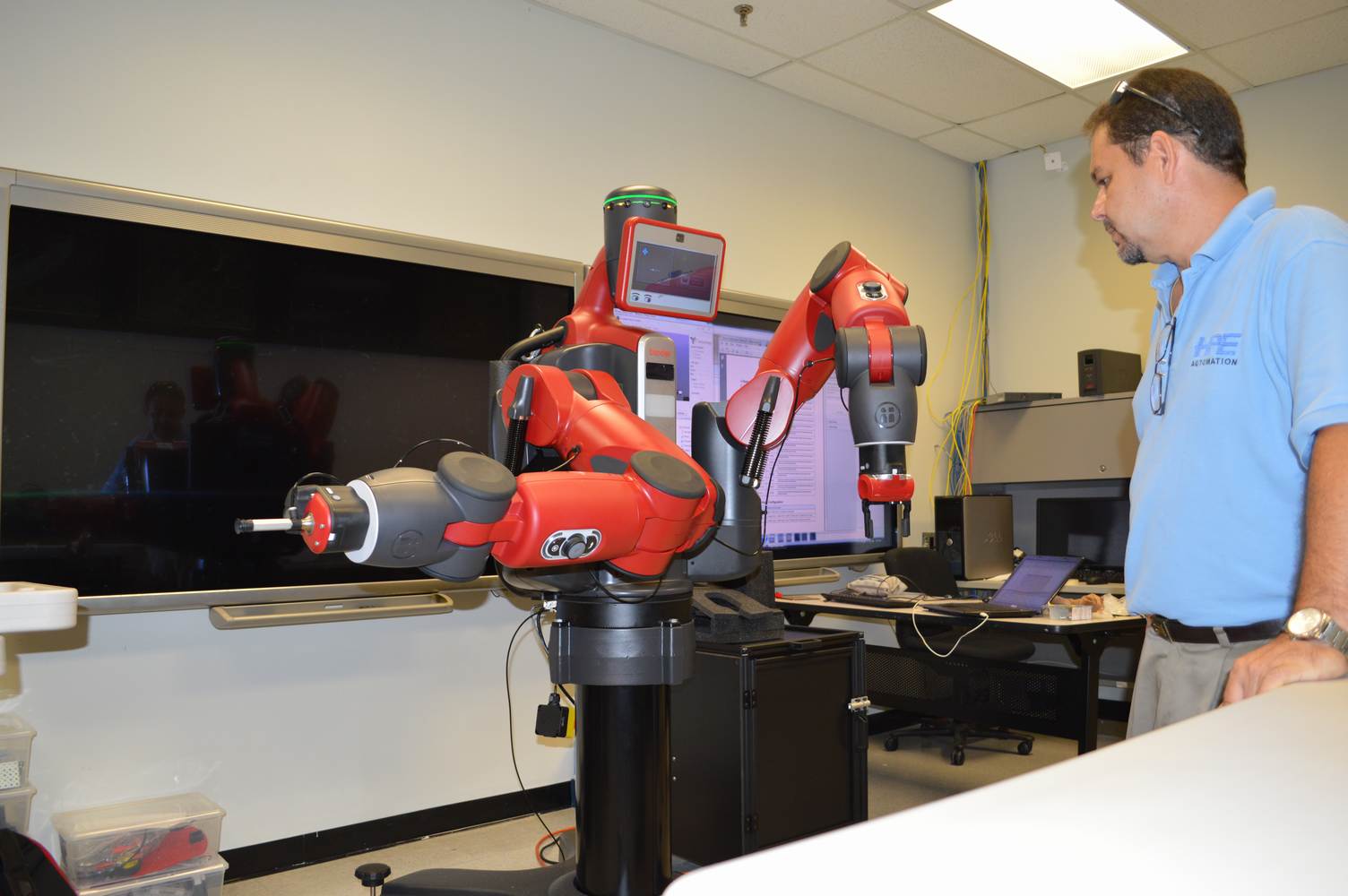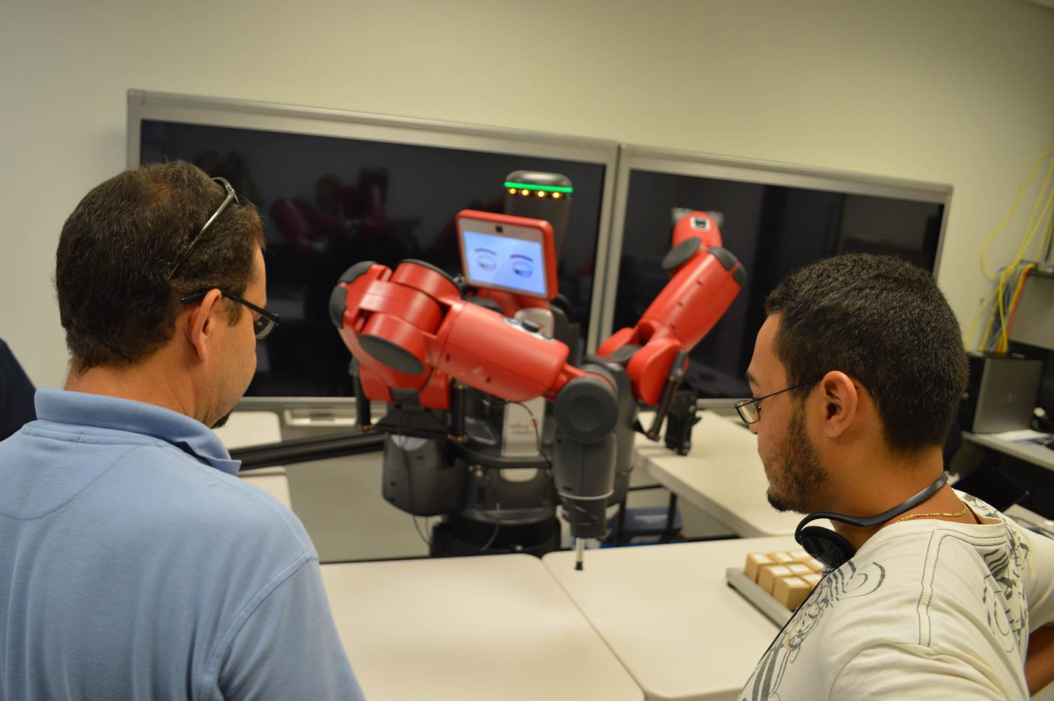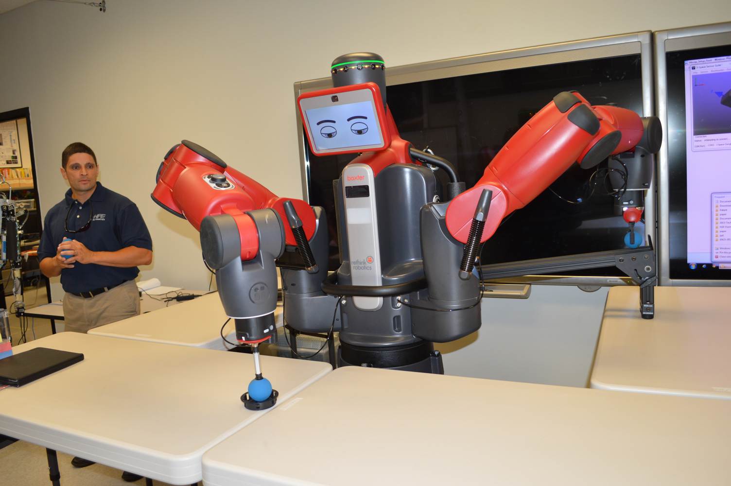 During last week, the Discovery Lab had a demonstration of Baxter, a robot by Rethink Robotics, meant to aid in industrial productions. The machine is a human sized robot, with two robotic arms with adaptable ends for different object sizes and shapes. It is incredibly easy to teach it new movements and has great versatility. Baxter has a ton of sensors for safety reasons that allow him to do things like sensing when a person is touching his arms and allow them to fully move them without resistance. He also has an ingenious interface where he nods or gives the user a confused look depending if he understood the commands or not. The Discovery Lab was considering to obtain one such machine for applications within the Telebot, but the end of that idea is still unclear. When all is placed into account, Baxter is a great improvement in the world of robotics.