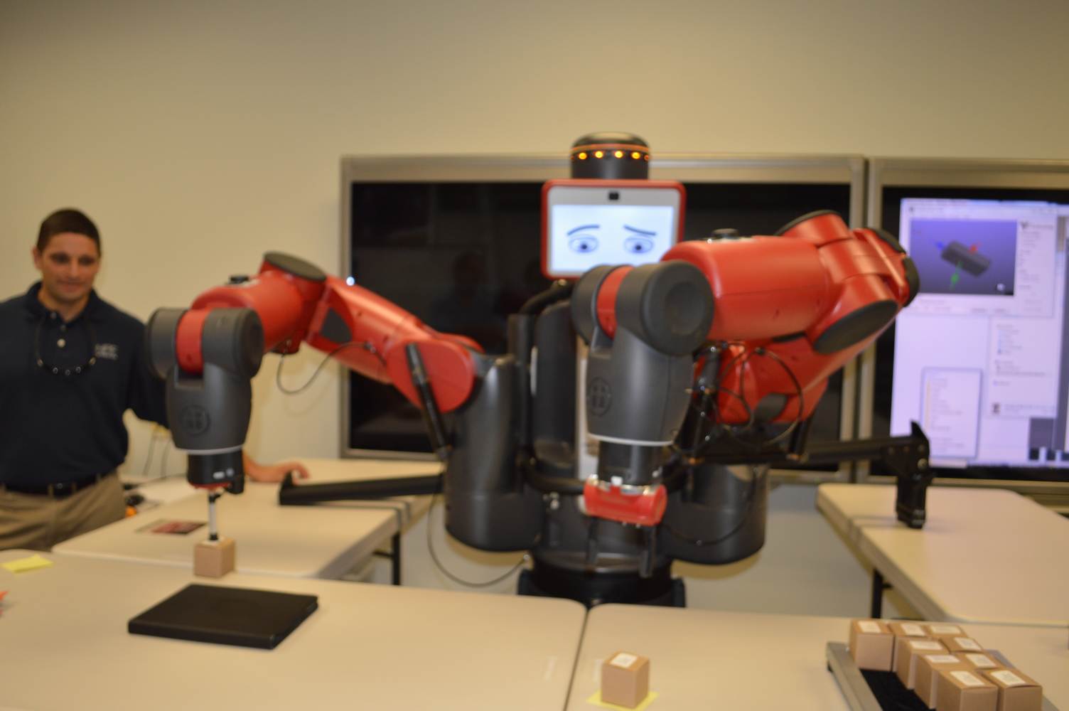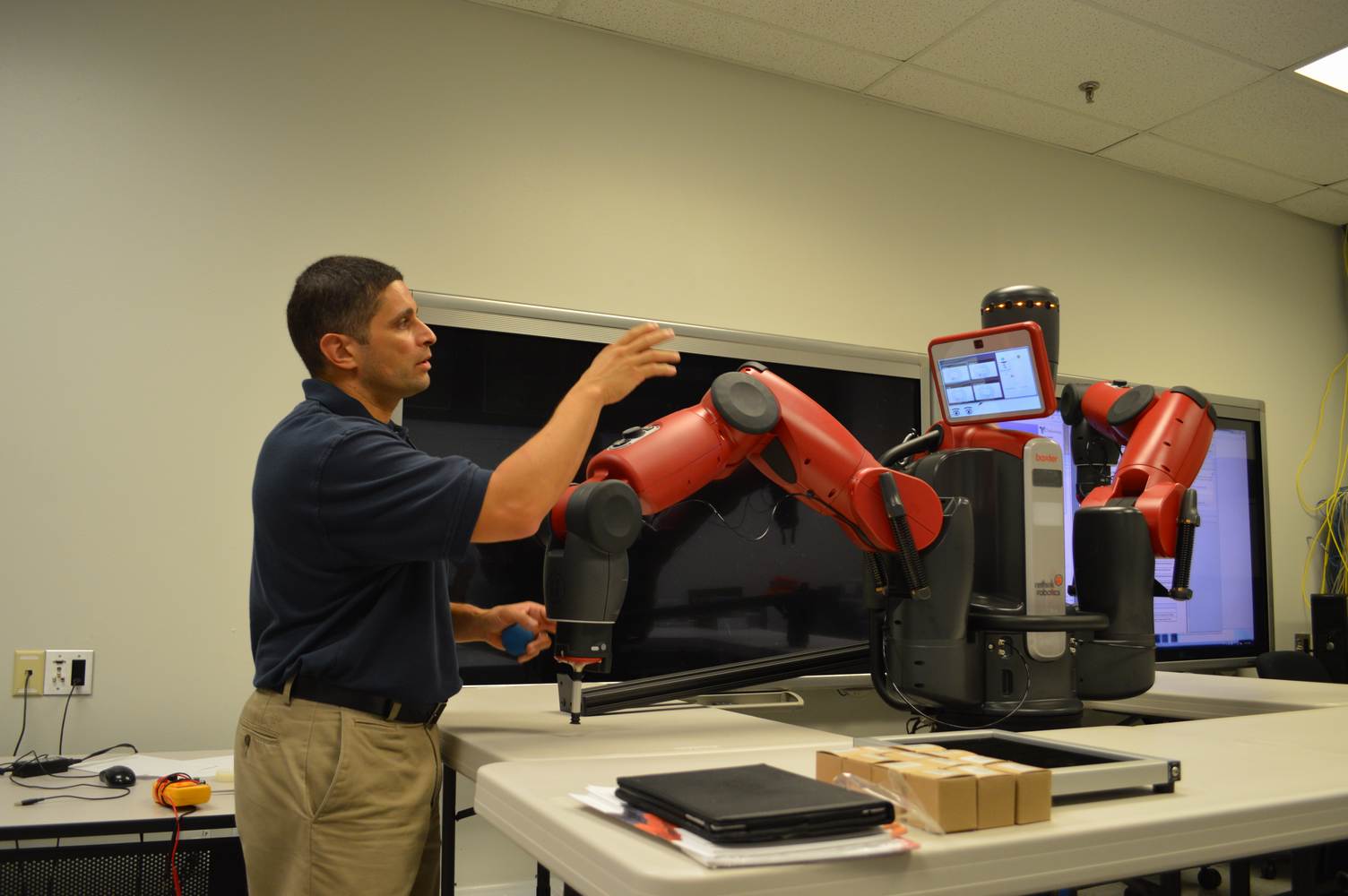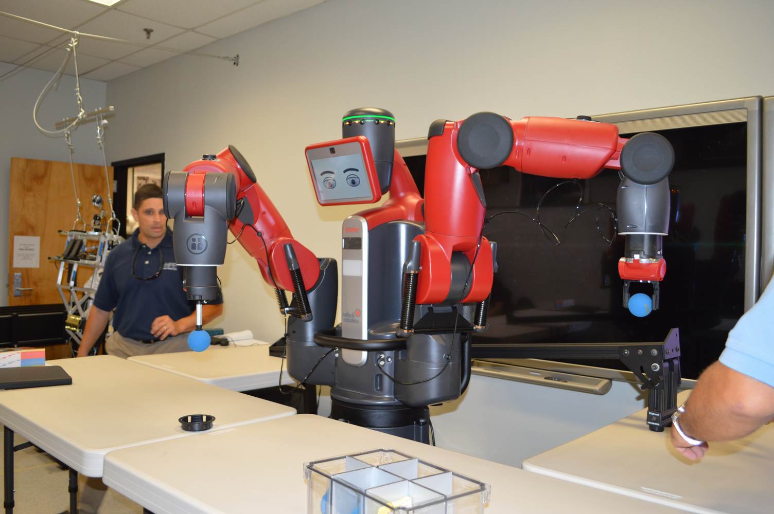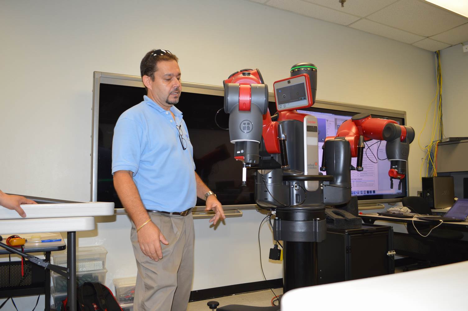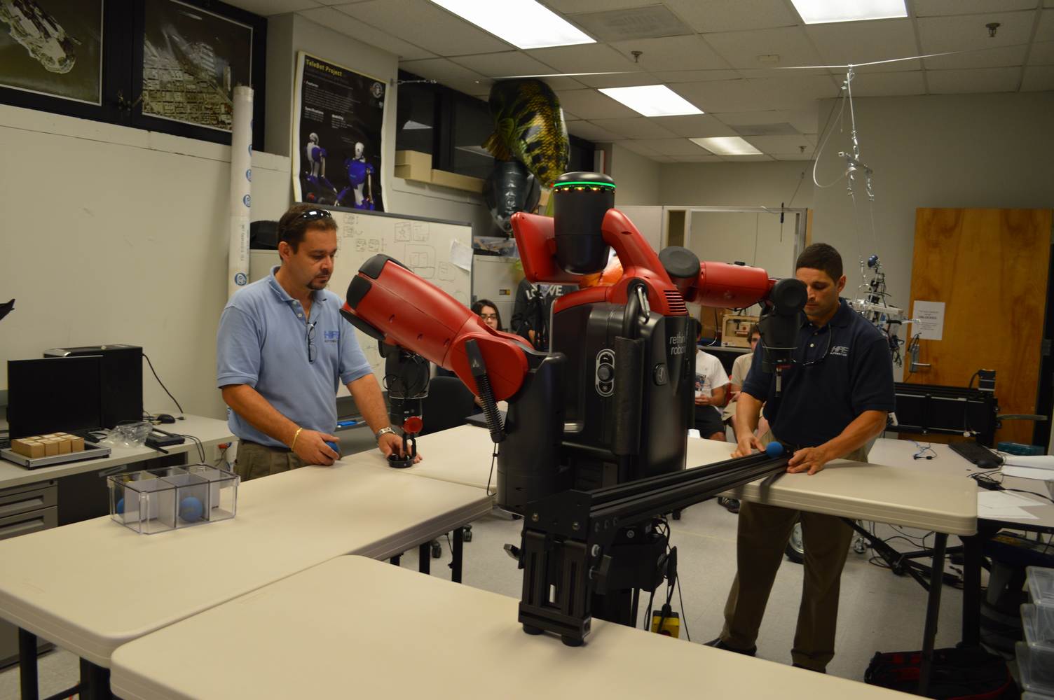 During last week, the Discovery Lab had a demonstration of Baxter, a robot by Rethink Robotics, meant to aid in industrial productions. The machine is a human sized robot, with two robotic arms with adaptable ends for different object sizes and shapes. It is incredibly easy to teach it new movements and has great versatility. Baxter has a ton of sensors for safety reasons that allow him to do things like sensing when a person is touching his arms and allow them to fully move them without resistance. He also has an ingenious interface where he nods or gives the user a confused look depending if he understood the commands or not. The Discovery Lab was considering to obtain one such machine for applications within the Telebot, but the end of that idea is still unclear. When all is placed into account, Baxter is a great improvement in the world of robotics.