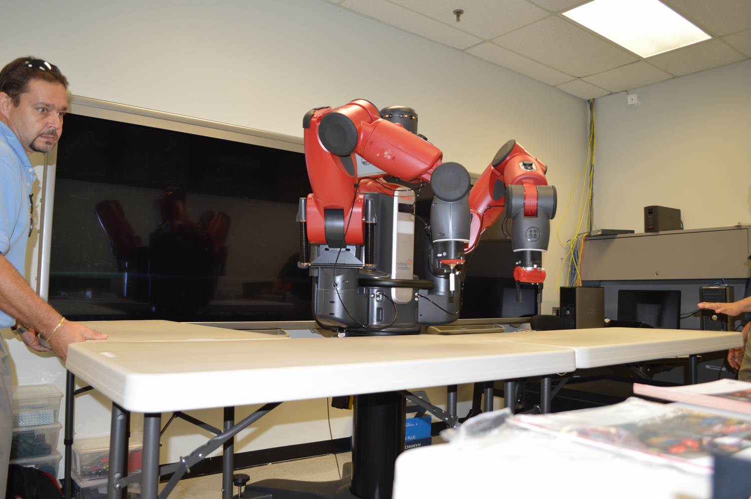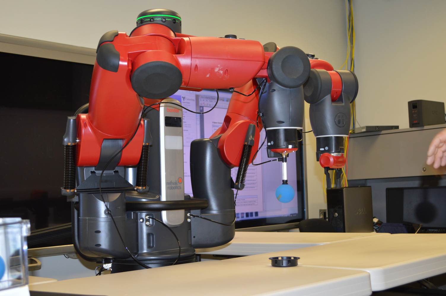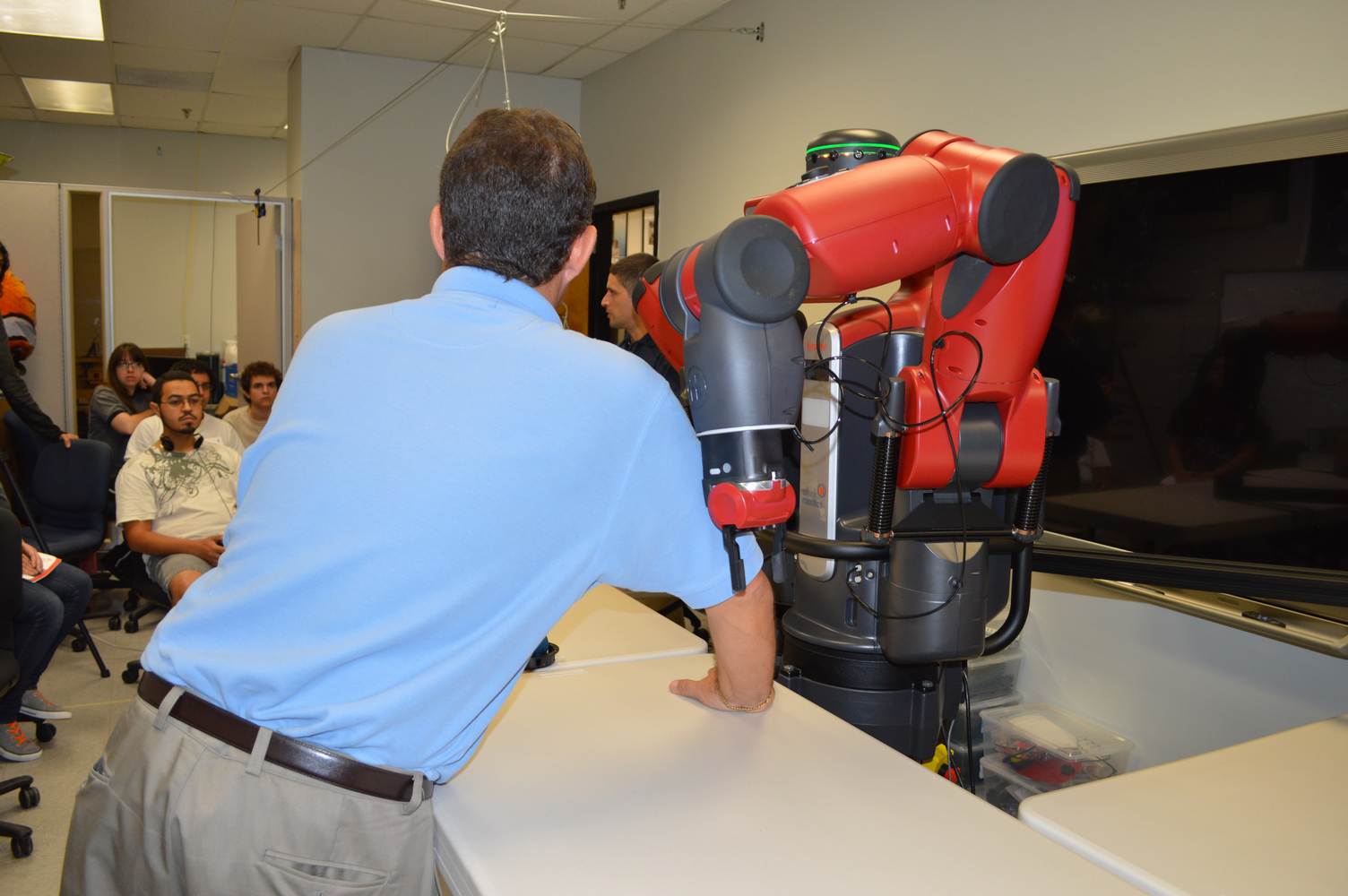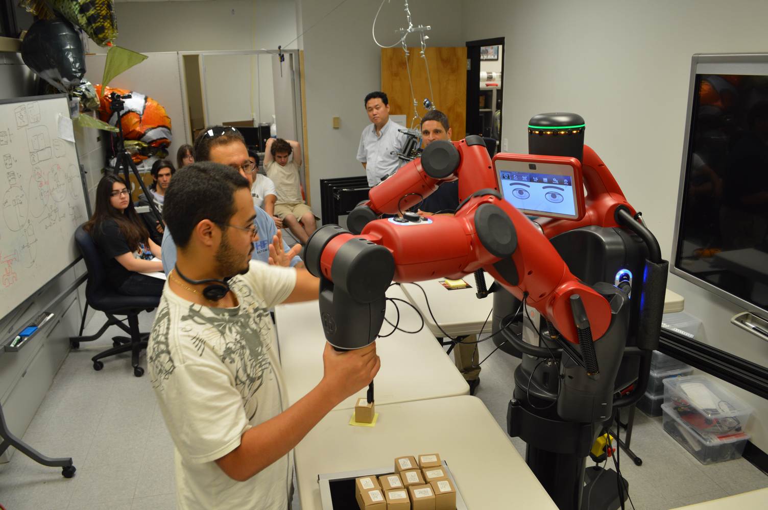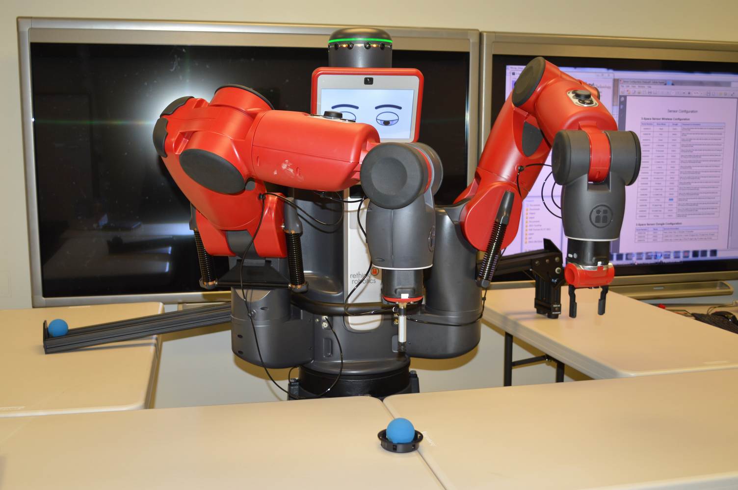 During last week, the Discovery Lab had a demonstration of Baxter, a robot by Rethink Robotics, meant to aid in industrial productions. The machine is a human sized robot, with two robotic arms with adaptable ends for different object sizes and shapes. It is incredibly easy to teach it new movements and has great versatility. Baxter has a ton of sensors for safety reasons that allow him to do things like sensing when a person is touching his arms and allow them to fully move them without resistance. He also has an ingenious interface where he nods or gives the user a confused look depending if he understood the commands or not. The Discovery Lab was considering to obtain one such machine for applications within the Telebot, but the end of that idea is still unclear. When all is placed into account, Baxter is a great improvement in the world of robotics.