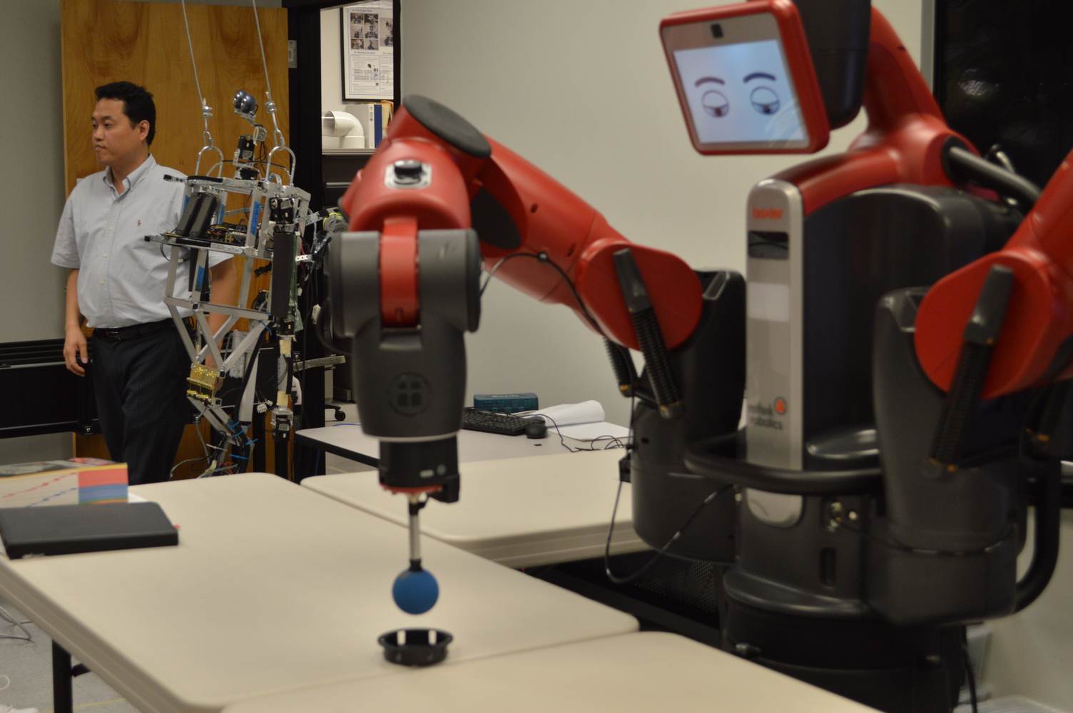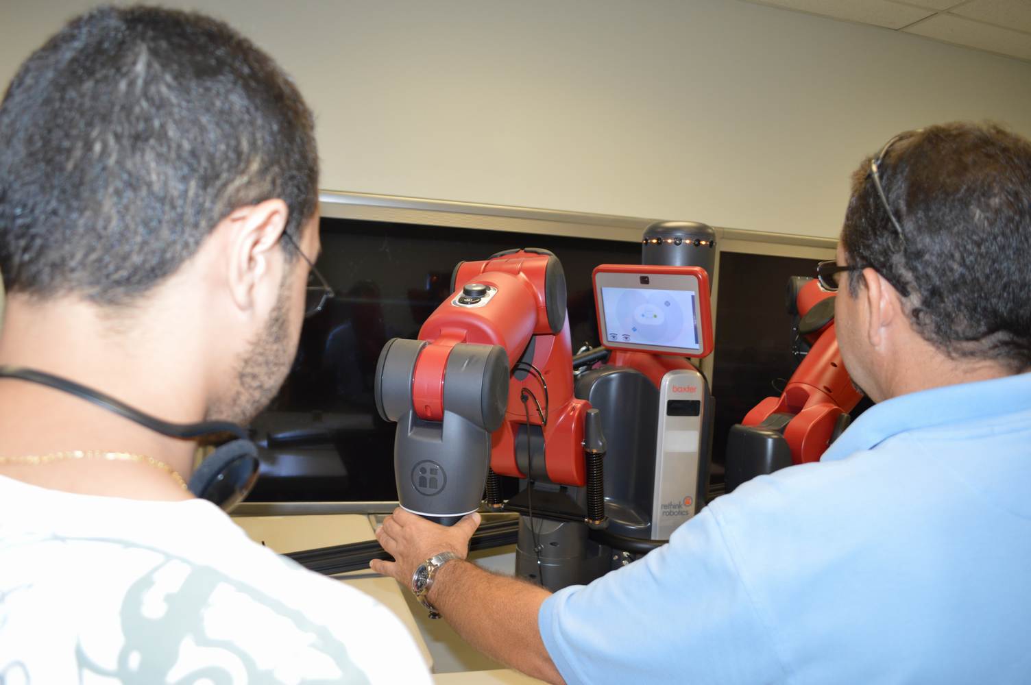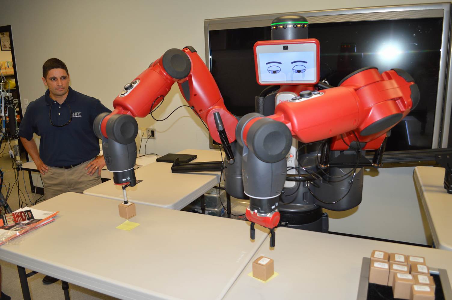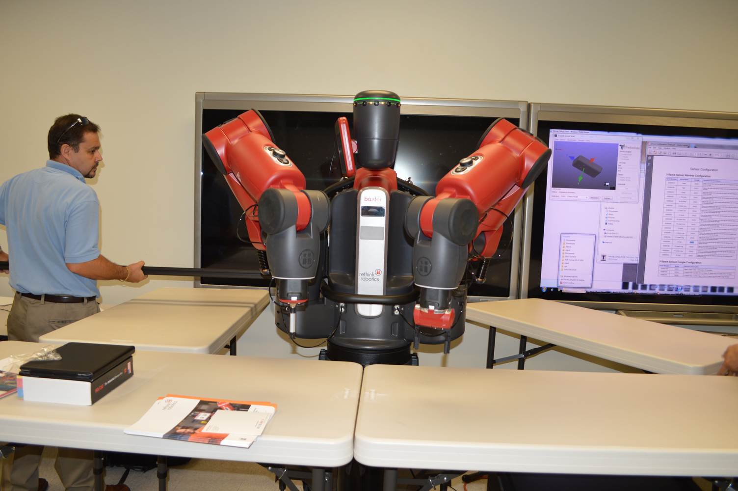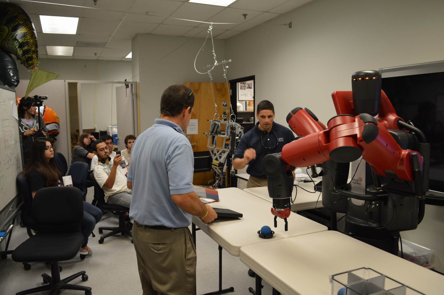 During last week, the Discovery Lab had a demonstration of Baxter, a robot by Rethink Robotics, meant to aid in industrial productions. The machine is a human sized robot, with two robotic arms with adaptable ends for different object sizes and shapes. It is incredibly easy to teach it new movements and has great versatility. Baxter has a ton of sensors for safety reasons that allow him to do things like sensing when a person is touching his arms and allow them to fully move them without resistance. He also has an ingenious interface where he nods or gives the user a confused look depending if he understood the commands or not. The Discovery Lab was considering to obtain one such machine for applications within the Telebot, but the end of that idea is still unclear. When all is placed into account, Baxter is a great improvement in the world of robotics.