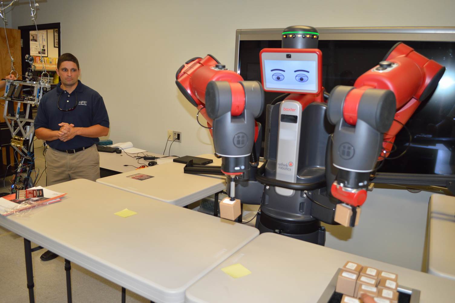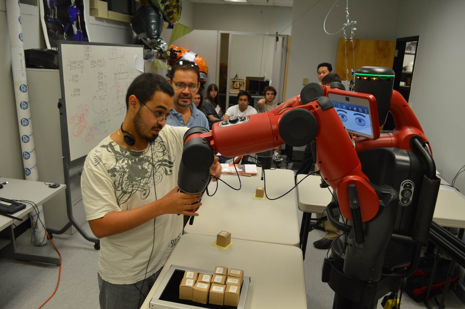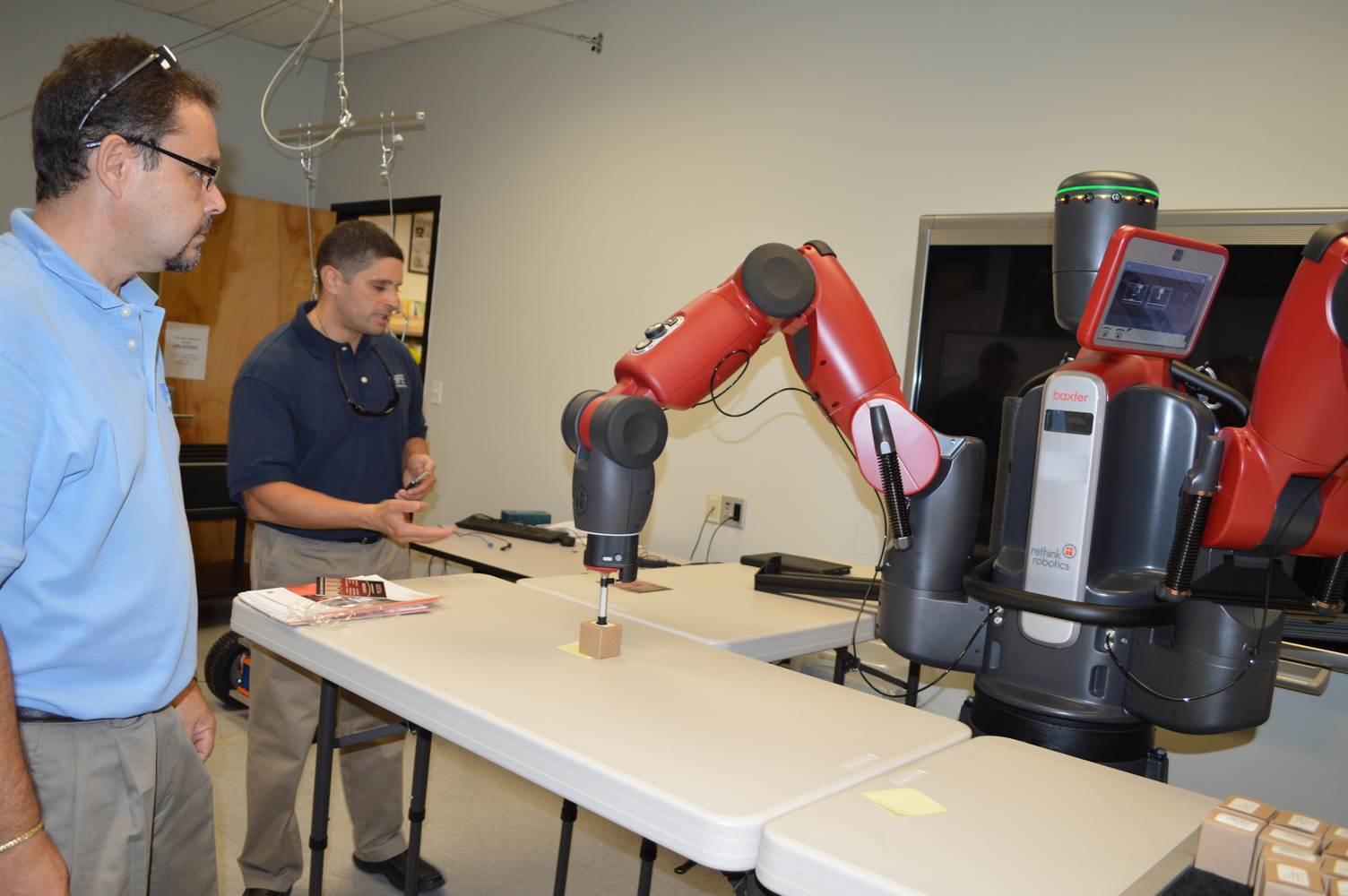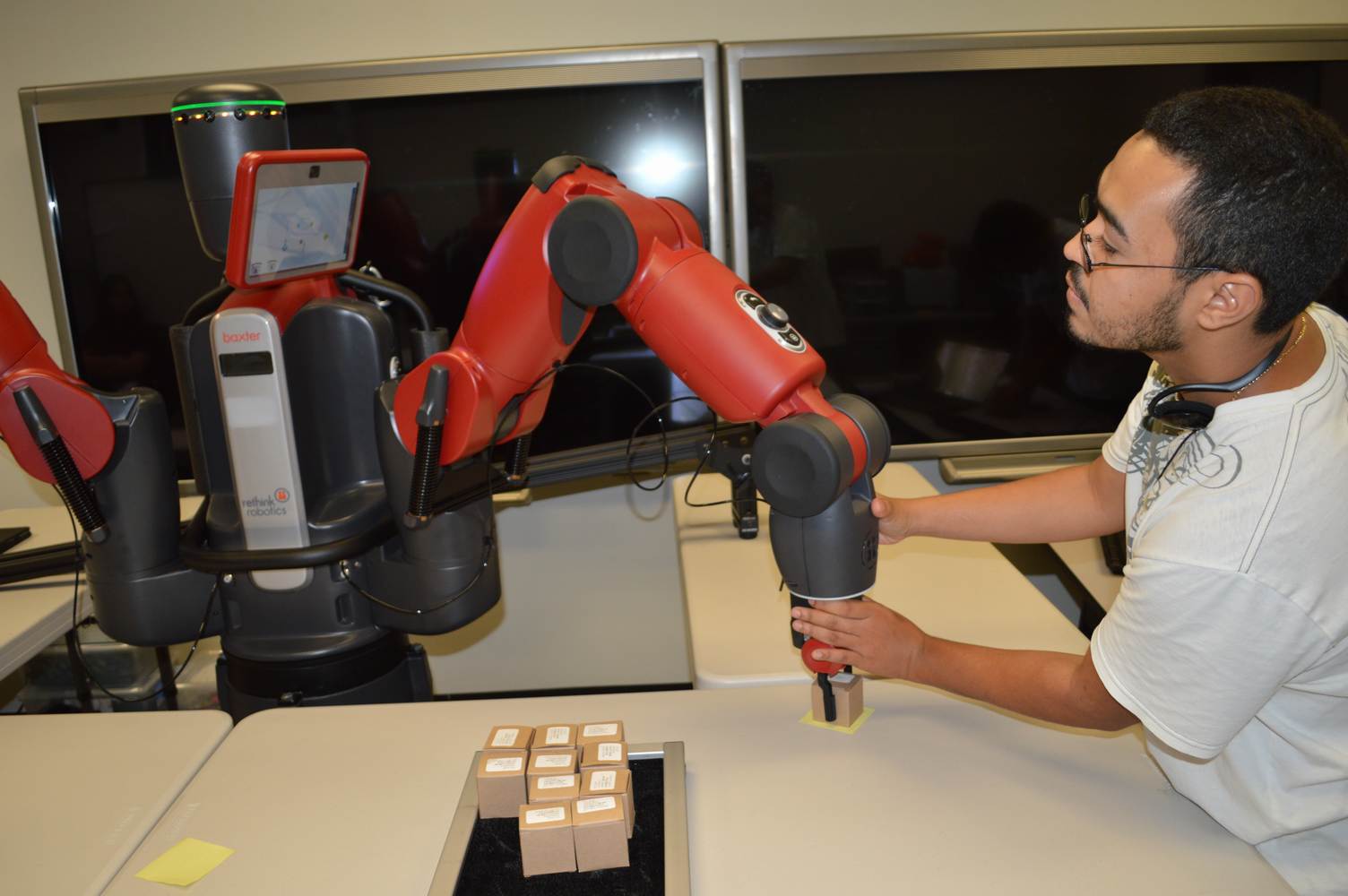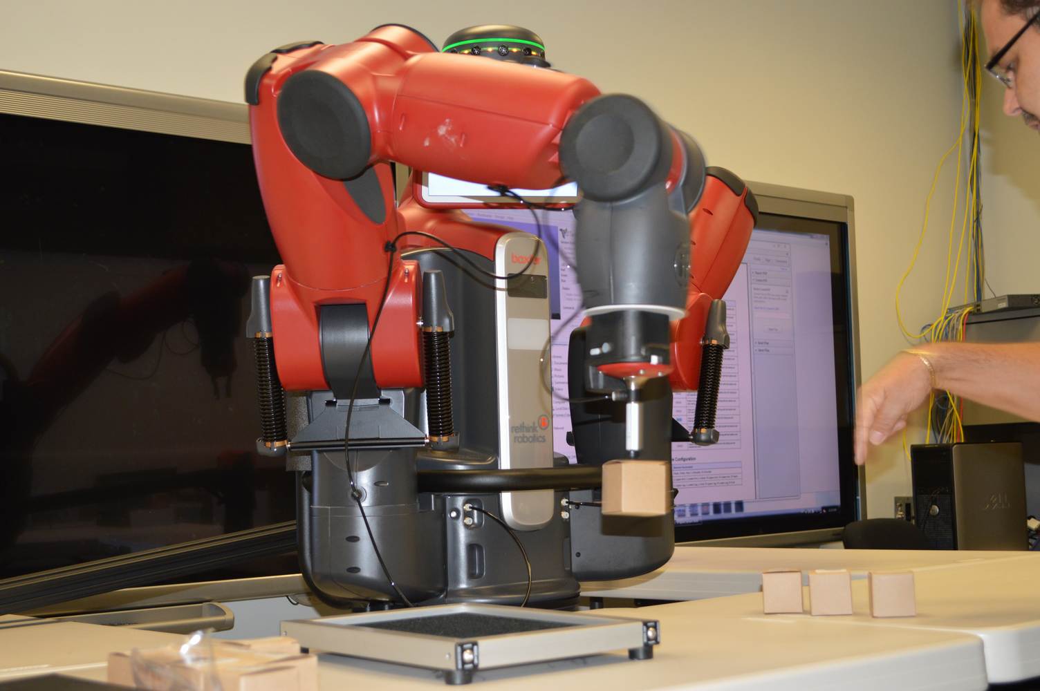 During last week, the Discovery Lab had a demonstration of Baxter, a robot by Rethink Robotics, meant to aid in industrial productions. The machine is a human sized robot, with two robotic arms with adaptable ends for different object sizes and shapes. It is incredibly easy to teach it new movements and has great versatility. Baxter has a ton of sensors for safety reasons that allow him to do things like sensing when a person is touching his arms and allow them to fully move them without resistance. He also has an ingenious interface where he nods or gives the user a confused look depending if he understood the commands or not. The Discovery Lab was considering to obtain one such machine for applications within the Telebot, but the end of that idea is still unclear. When all is placed into account, Baxter is a great improvement in the world of robotics.