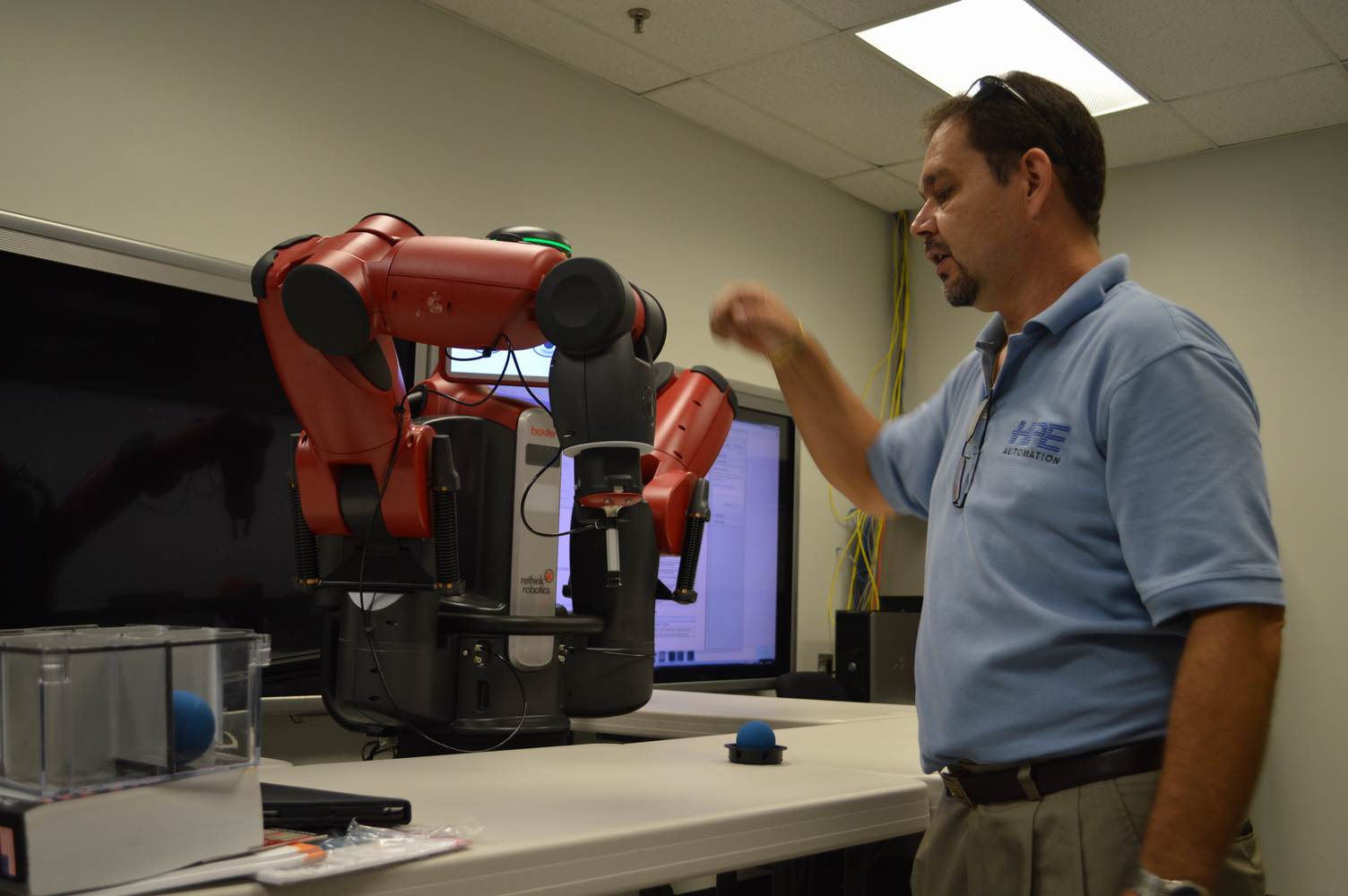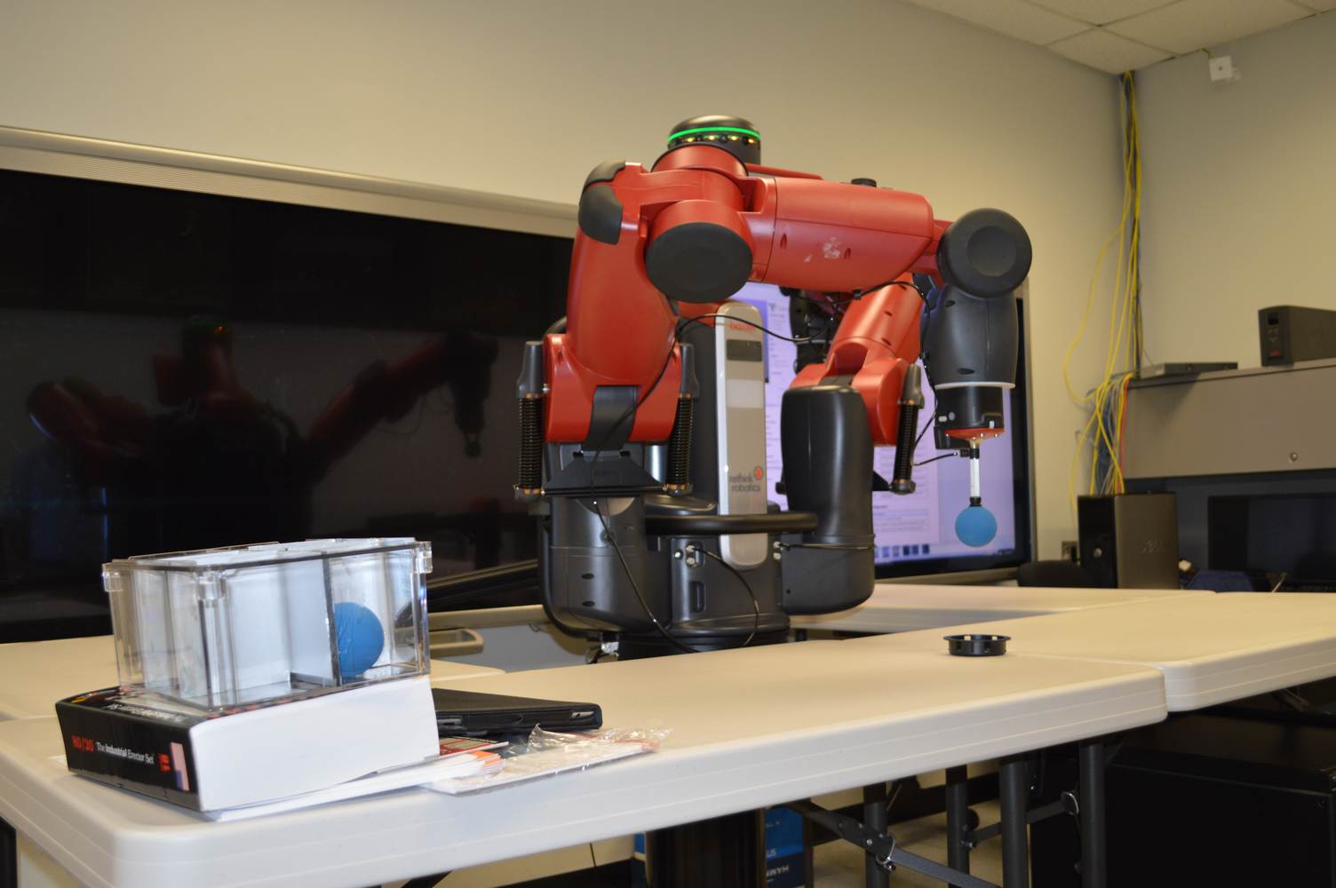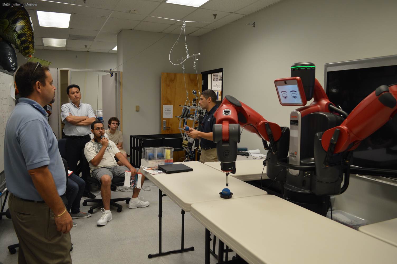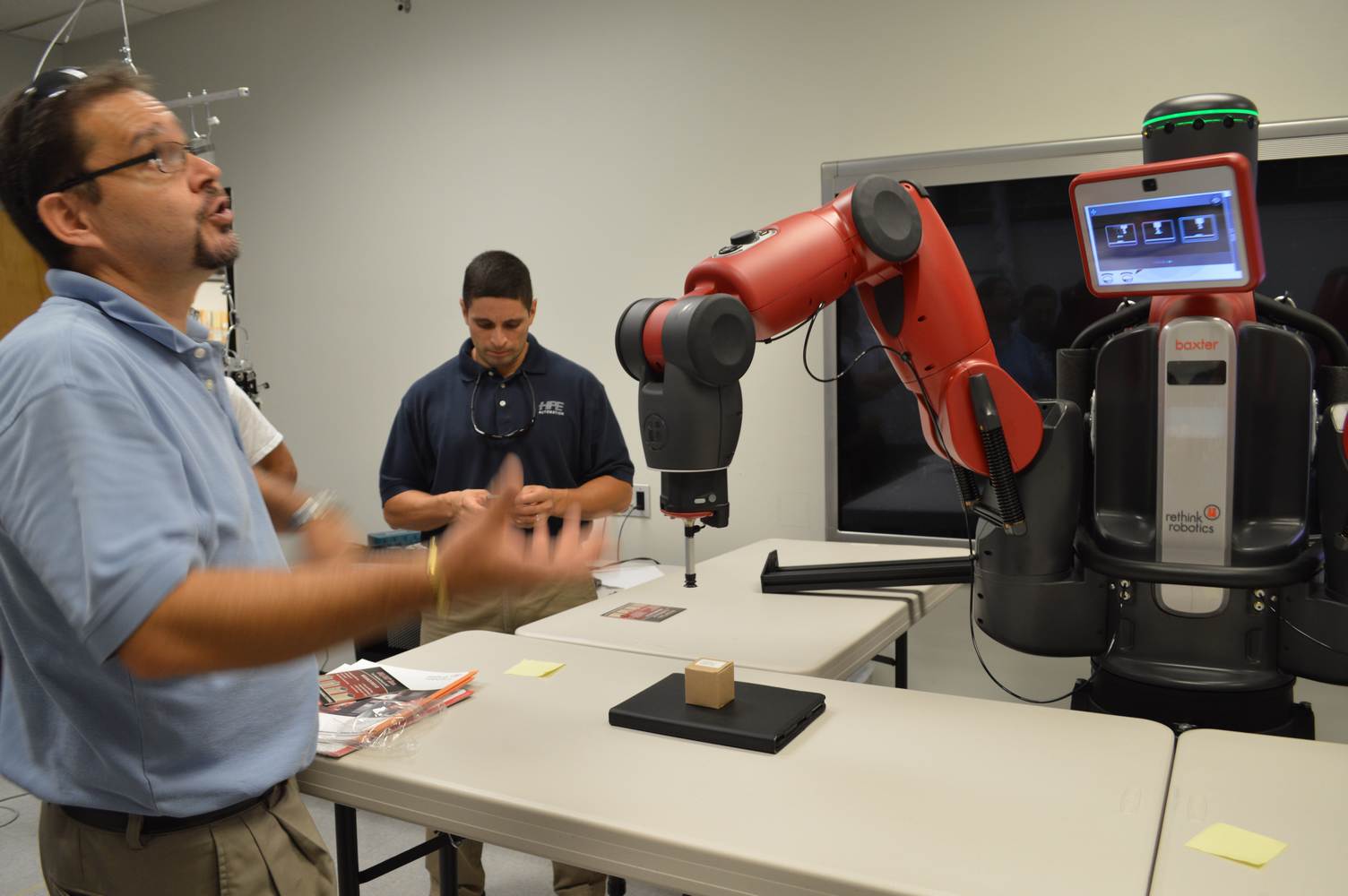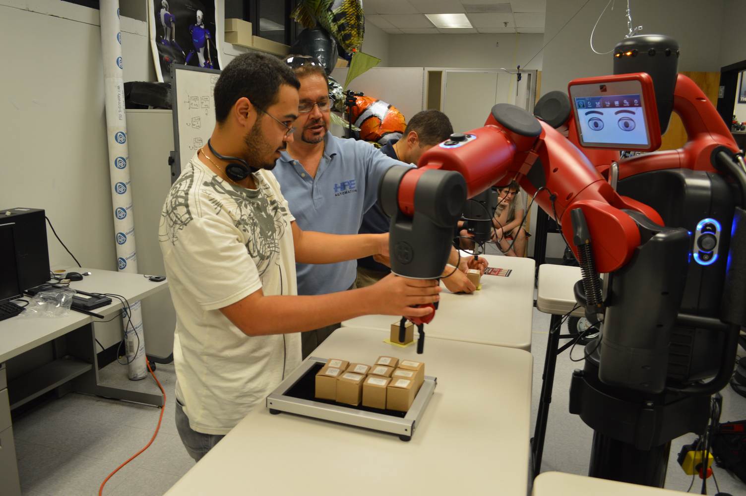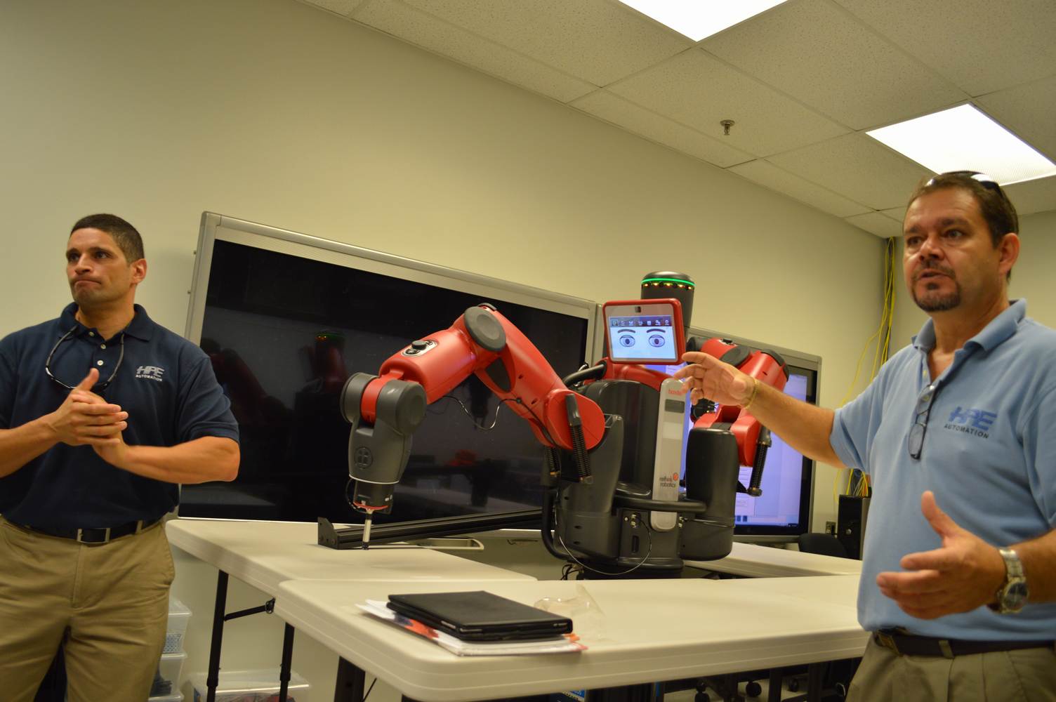 During last week, the Discovery Lab had a demonstration of Baxter, a robot by Rethink Robotics, meant to aid in industrial productions. The machine is a human sized robot, with two robotic arms with adaptable ends for different object sizes and shapes. It is incredibly easy to teach it new movements and has great versatility. Baxter has a ton of sensors for safety reasons that allow him to do things like sensing when a person is touching his arms and allow them to fully move them without resistance. He also has an ingenious interface where he nods or gives the user a confused look depending if he understood the commands or not. The Discovery Lab was considering to obtain one such machine for applications within the Telebot, but the end of that idea is still unclear. When all is placed into account, Baxter is a great improvement in the world of robotics.
