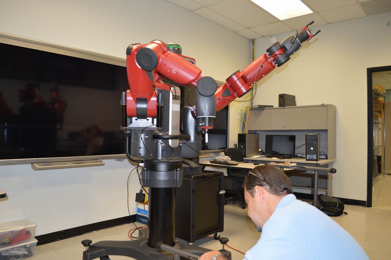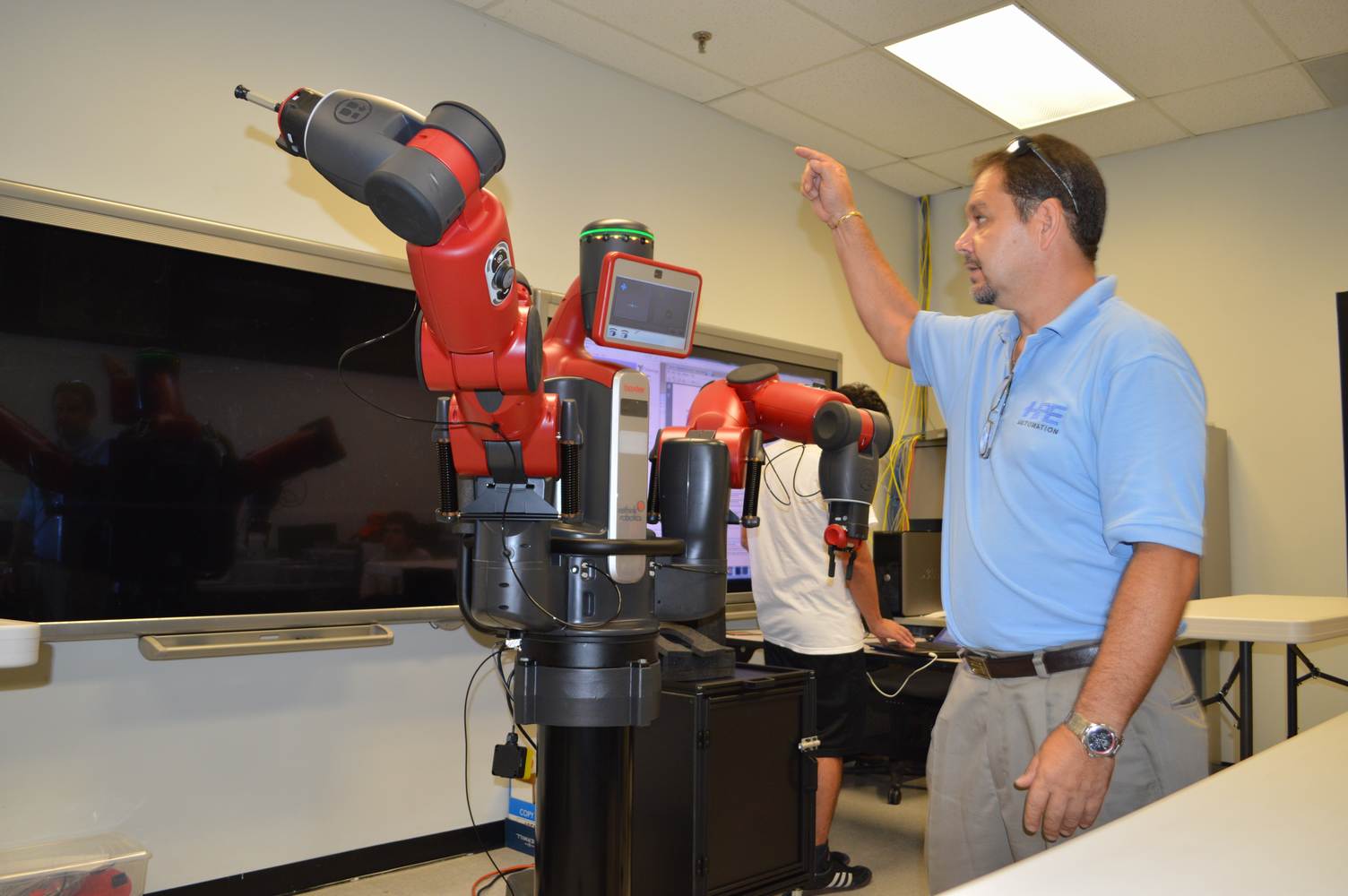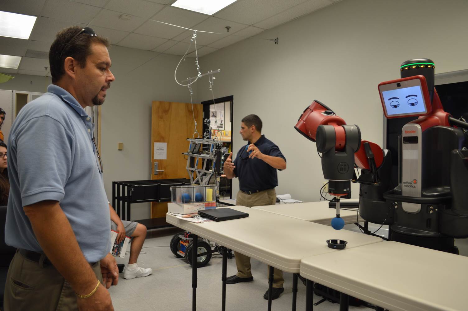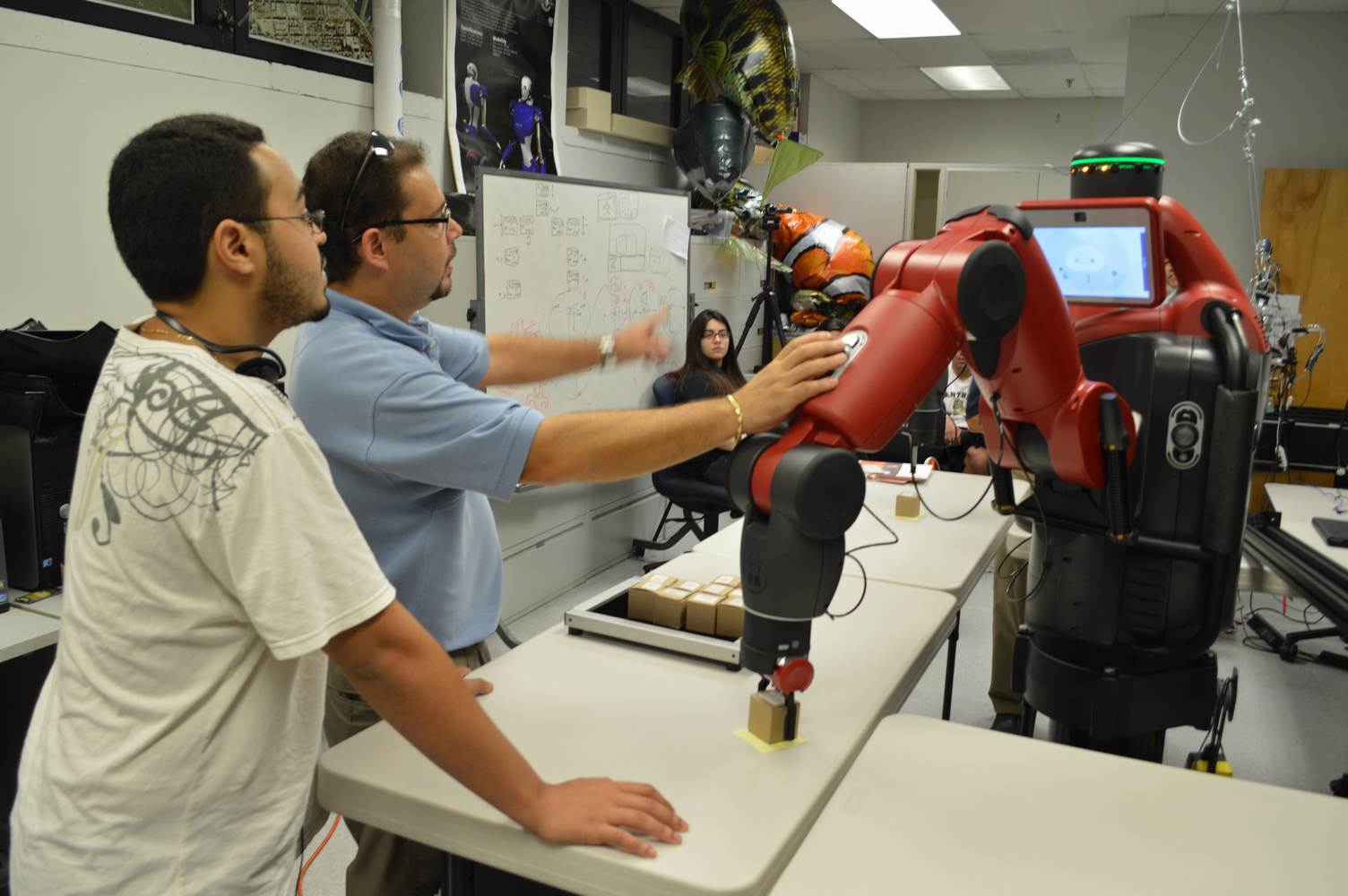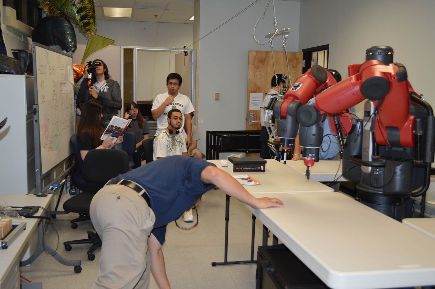 During last week, the Discovery Lab had a demonstration of Baxter, a robot by Rethink Robotics, meant to aid in industrial productions. The machine is a human sized robot, with two robotic arms with adaptable ends for different object sizes and shapes. It is incredibly easy to teach it new movements and has great versatility. Baxter has a ton of sensors for safety reasons that allow him to do things like sensing when a person is touching his arms and allow them to fully move them without resistance. He also has an ingenious interface where he nods or gives the user a confused look depending if he understood the commands or not. The Discovery Lab was considering to obtain one such machine for applications within the Telebot, but the end of that idea is still unclear. When all is placed into account, Baxter is a great improvement in the world of robotics.