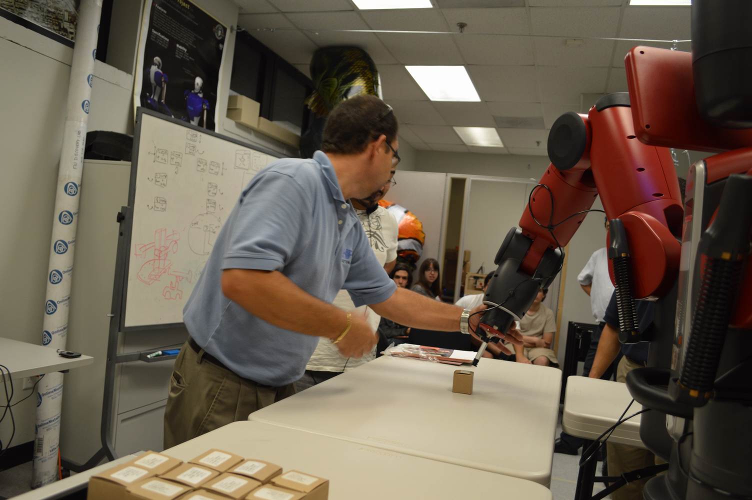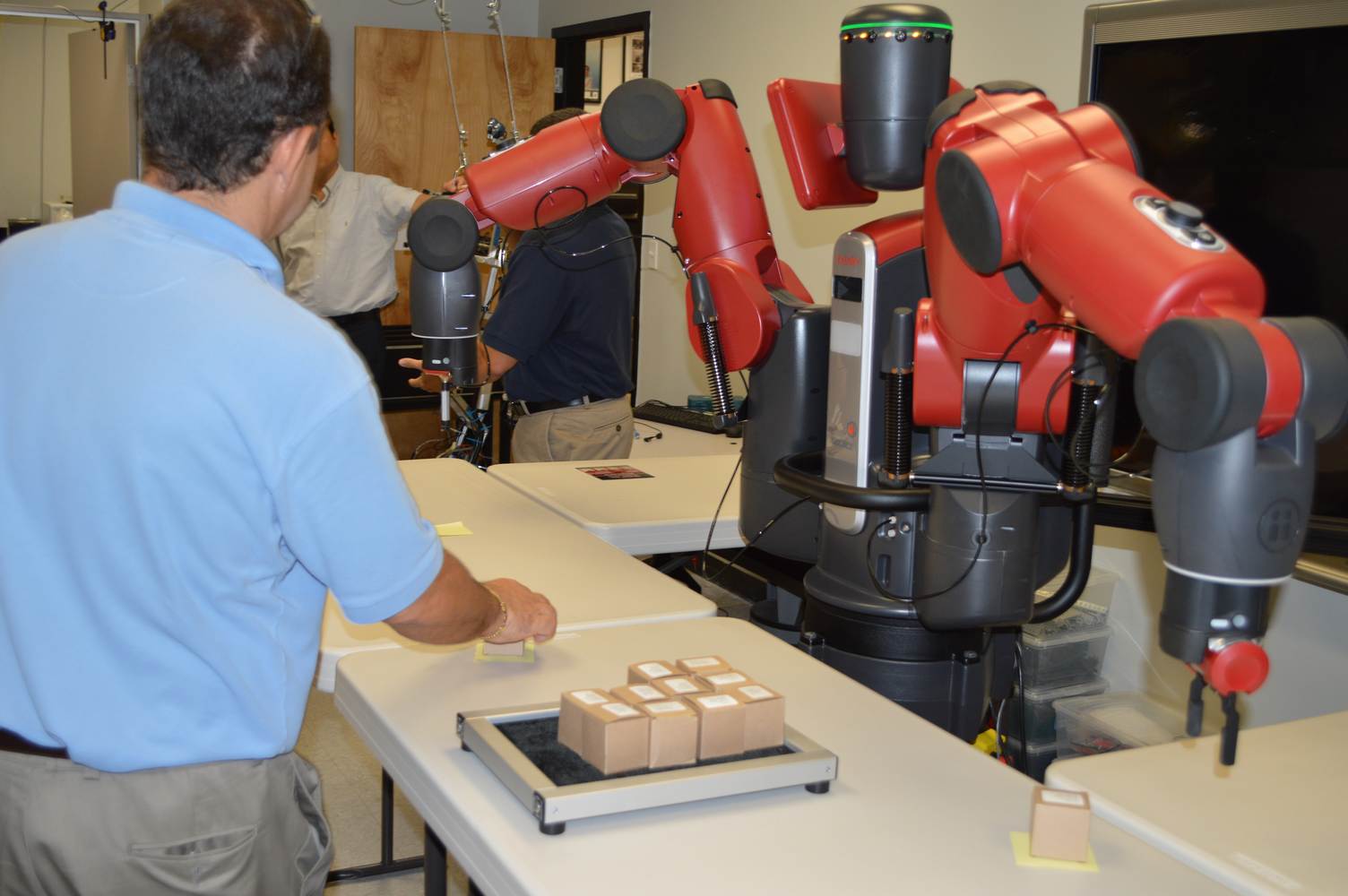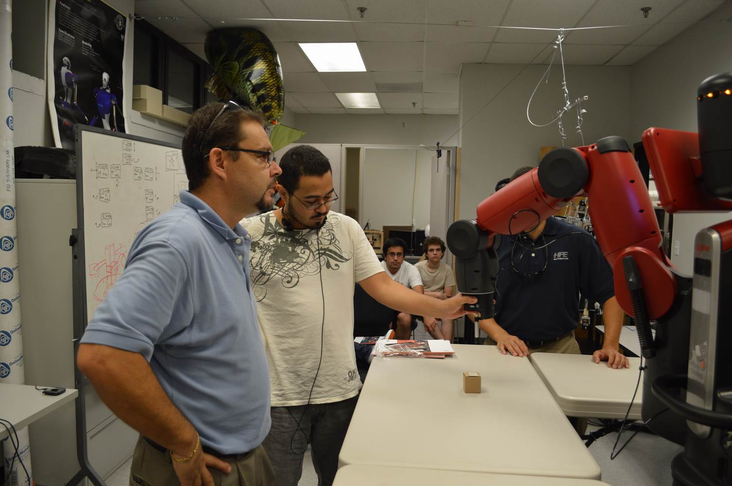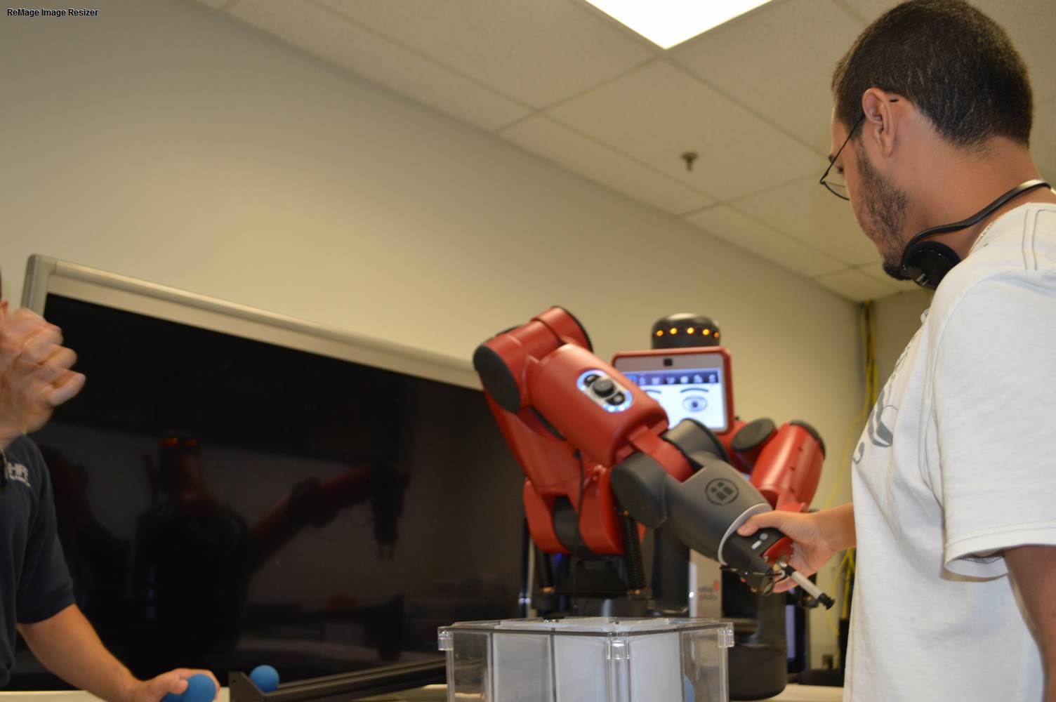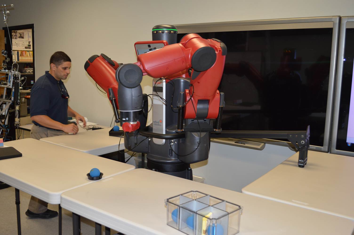 During last week, the Discovery Lab had a demonstration of Baxter, a robot by Rethink Robotics, meant to aid in industrial productions. The machine is a human sized robot, with two robotic arms with adaptable ends for different object sizes and shapes. It is incredibly easy to teach it new movements and has great versatility. Baxter has a ton of sensors for safety reasons that allow him to do things like sensing when a person is touching his arms and allow them to fully move them without resistance. He also has an ingenious interface where he nods or gives the user a confused look depending if he understood the commands or not. The Discovery Lab was considering to obtain one such machine for applications within the Telebot, but the end of that idea is still unclear. When all is placed into account, Baxter is a great improvement in the world of robotics.