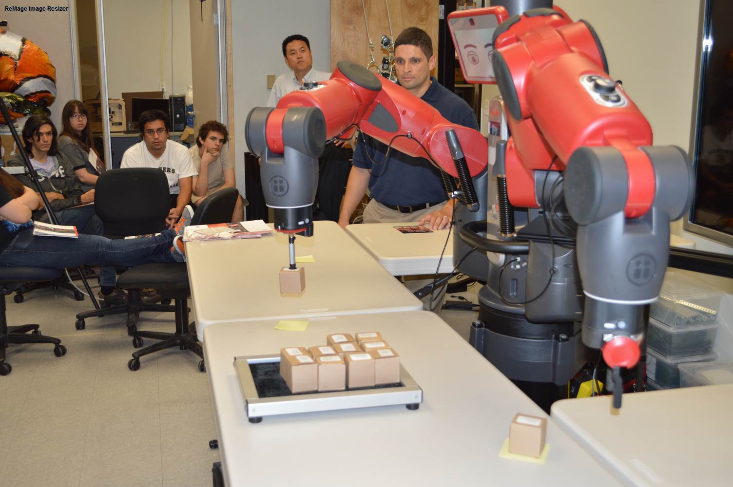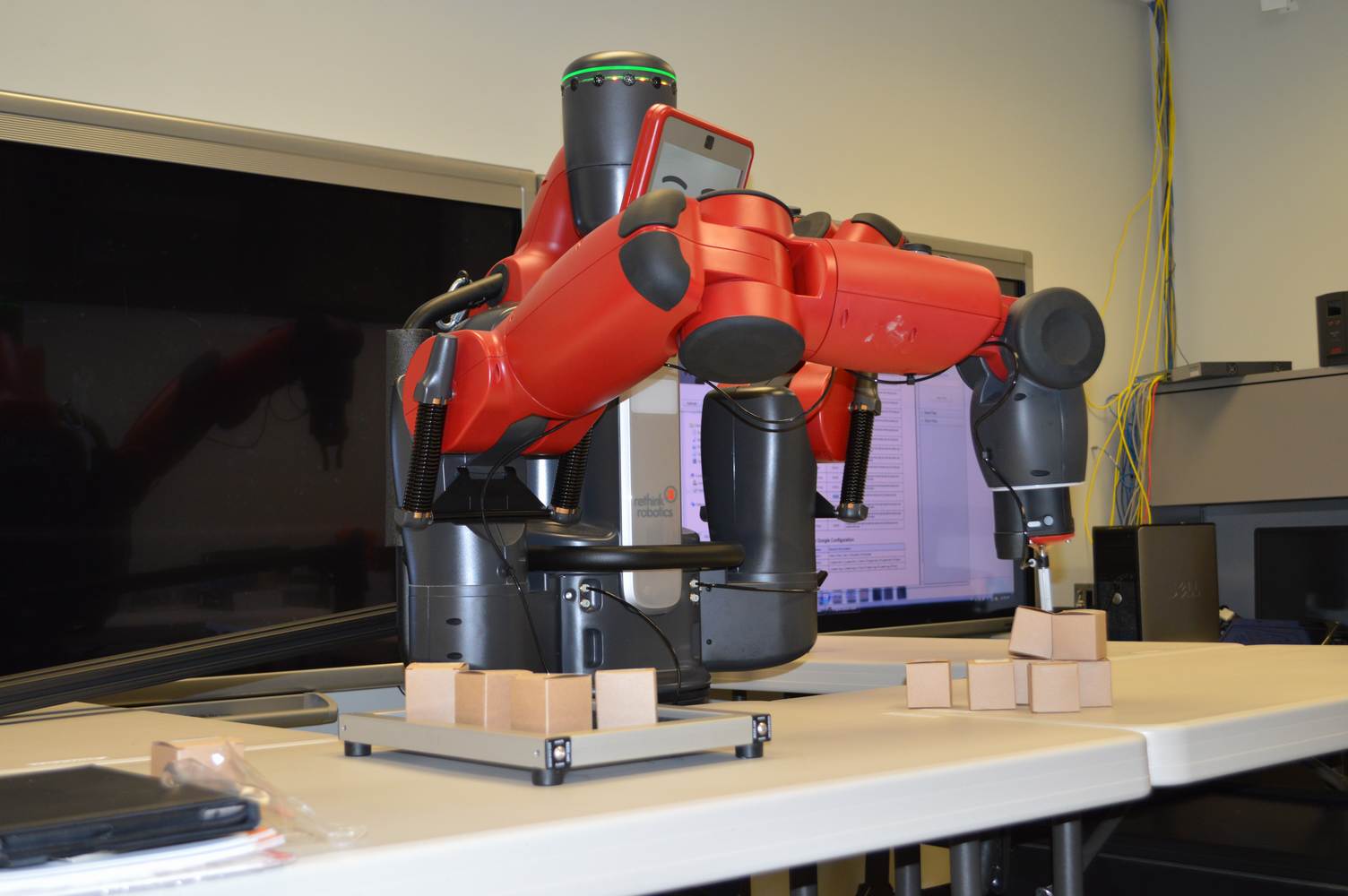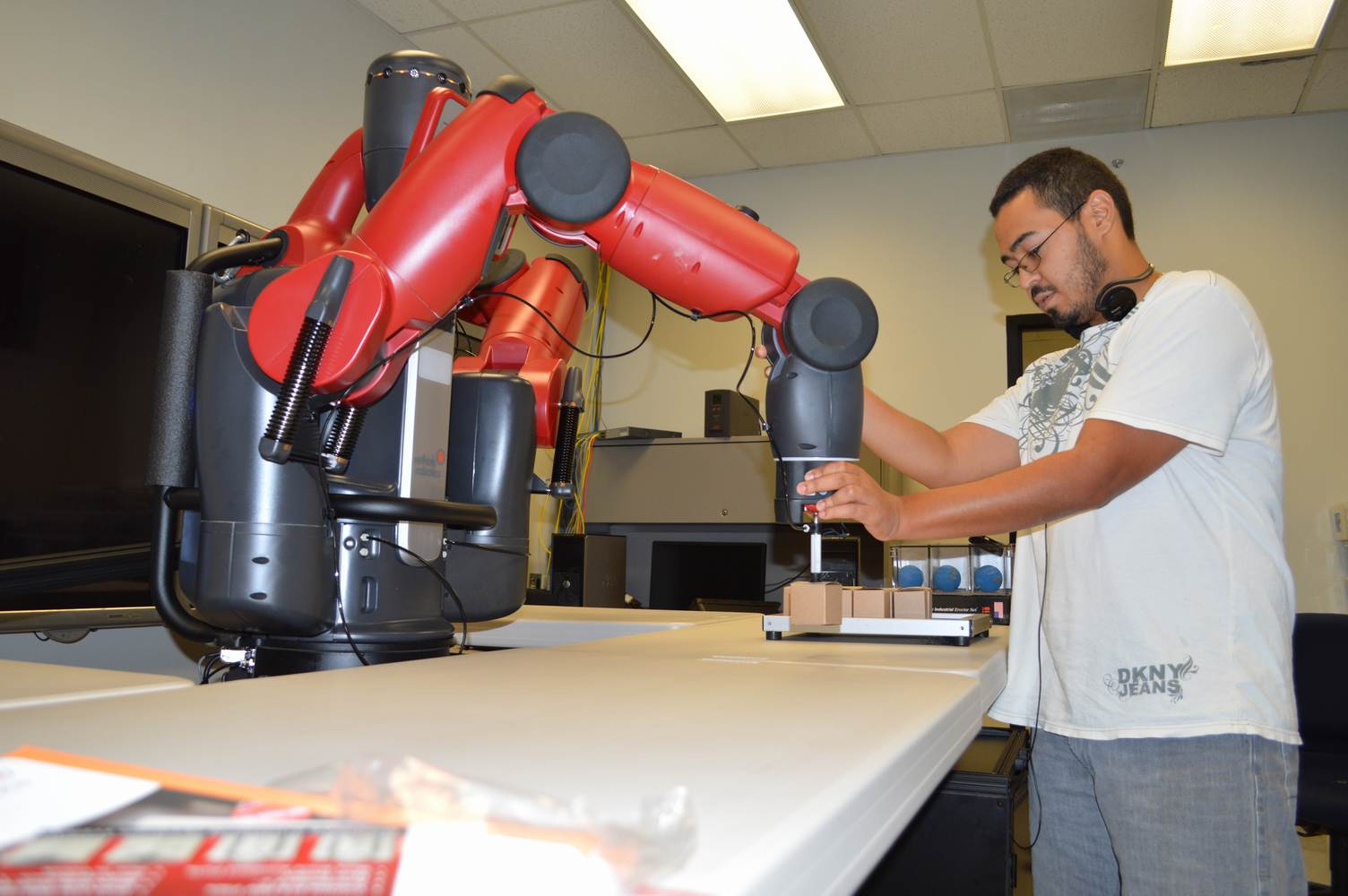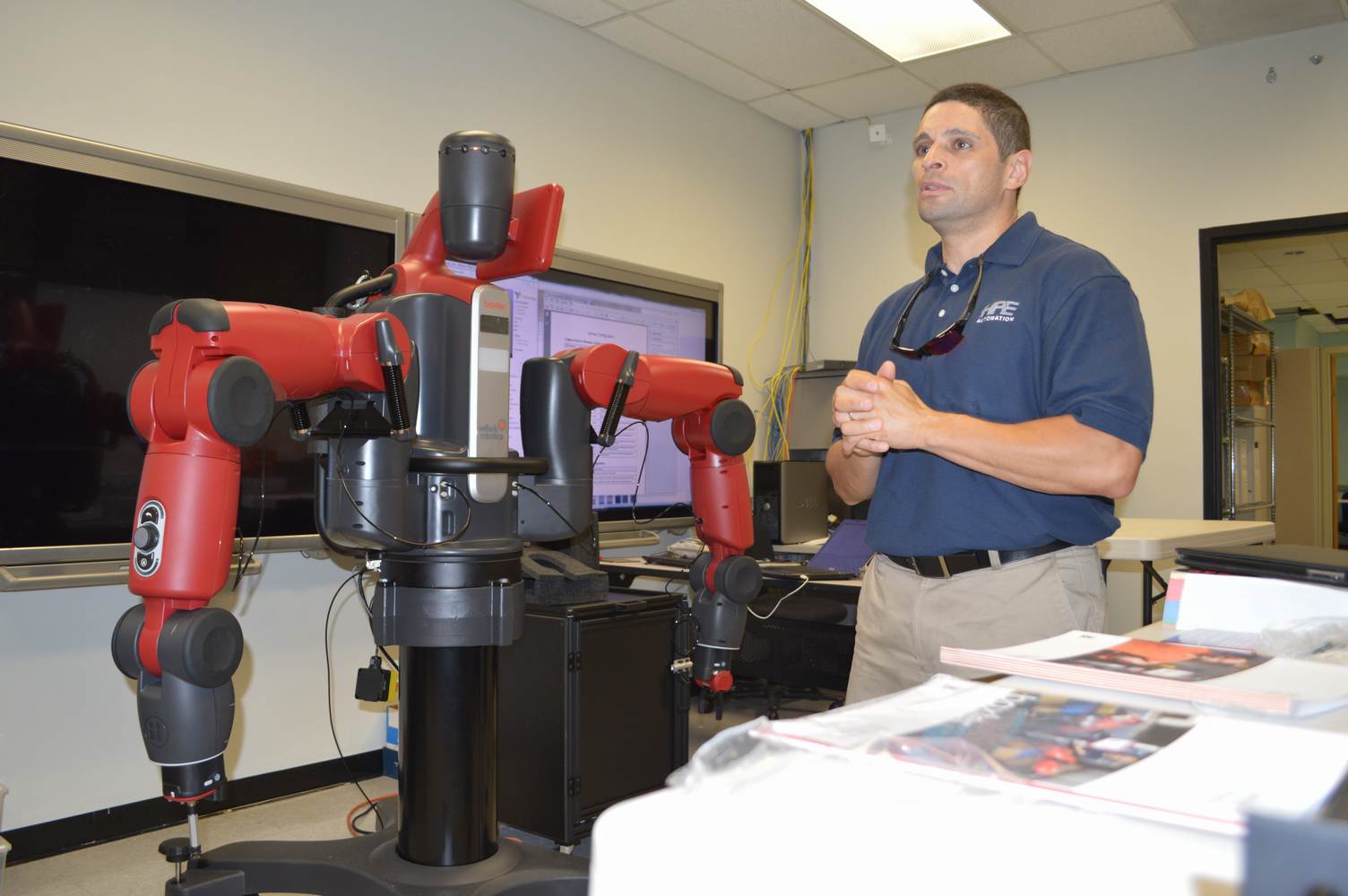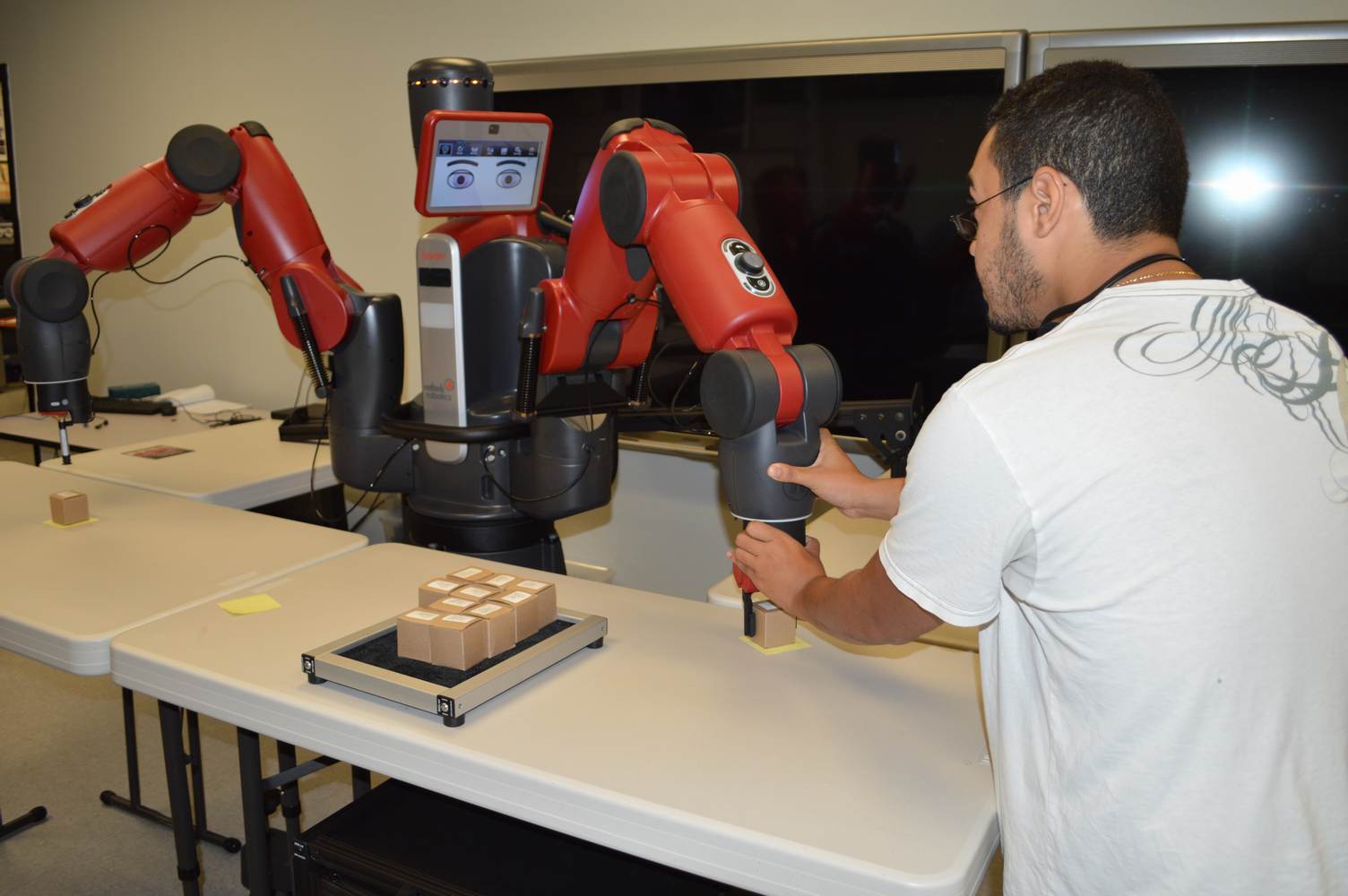 During last week, the Discovery Lab had a demonstration of Baxter, a robot by Rethink Robotics, meant to aid in industrial productions. The machine is a human sized robot, with two robotic arms with adaptable ends for different object sizes and shapes. It is incredibly easy to teach it new movements and has great versatility. Baxter has a ton of sensors for safety reasons that allow him to do things like sensing when a person is touching his arms and allow them to fully move them without resistance. He also has an ingenious interface where he nods or gives the user a confused look depending if he understood the commands or not. The Discovery Lab was considering to obtain one such machine for applications within the Telebot, but the end of that idea is still unclear. When all is placed into account, Baxter is a great improvement in the world of robotics.