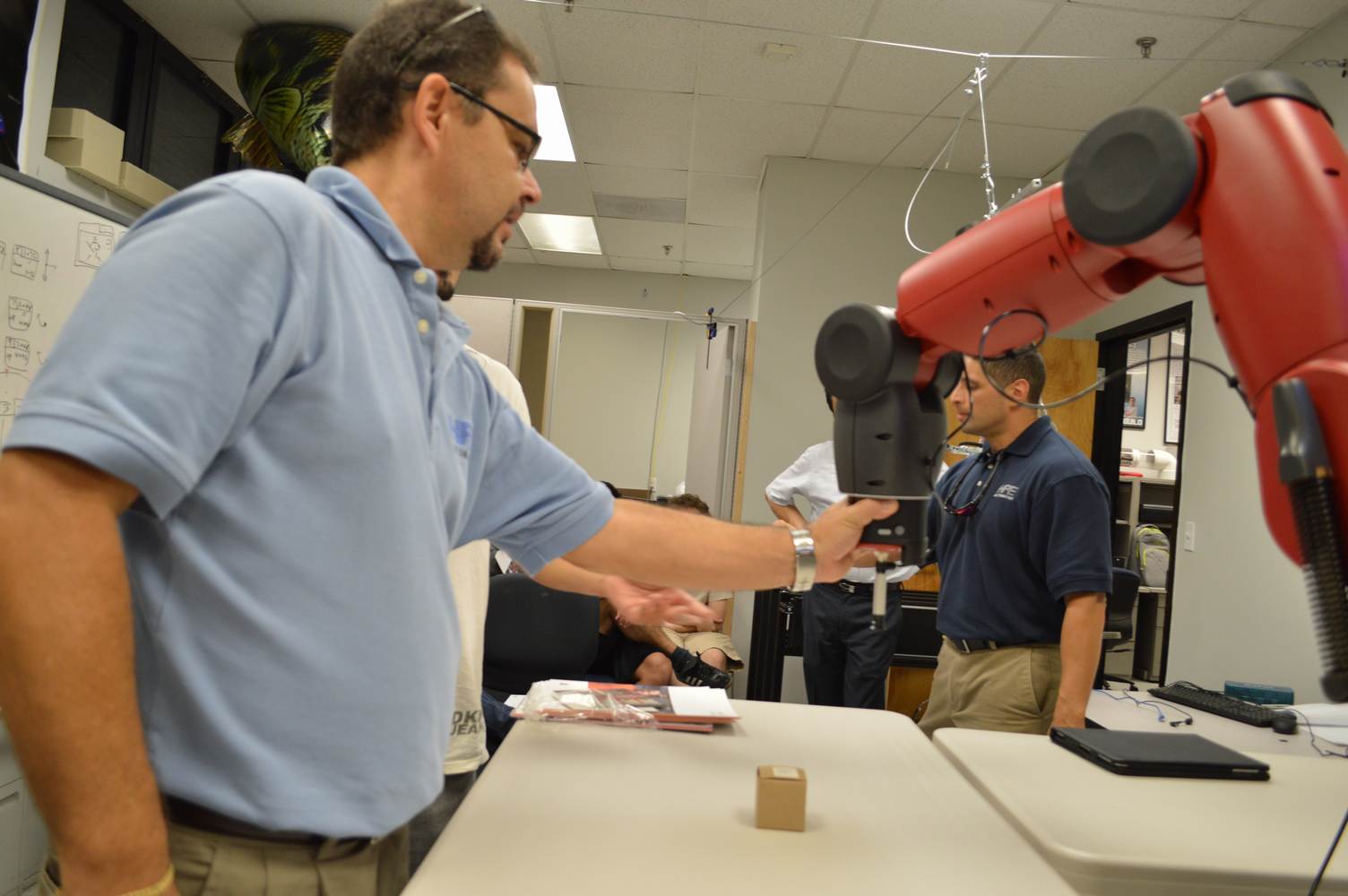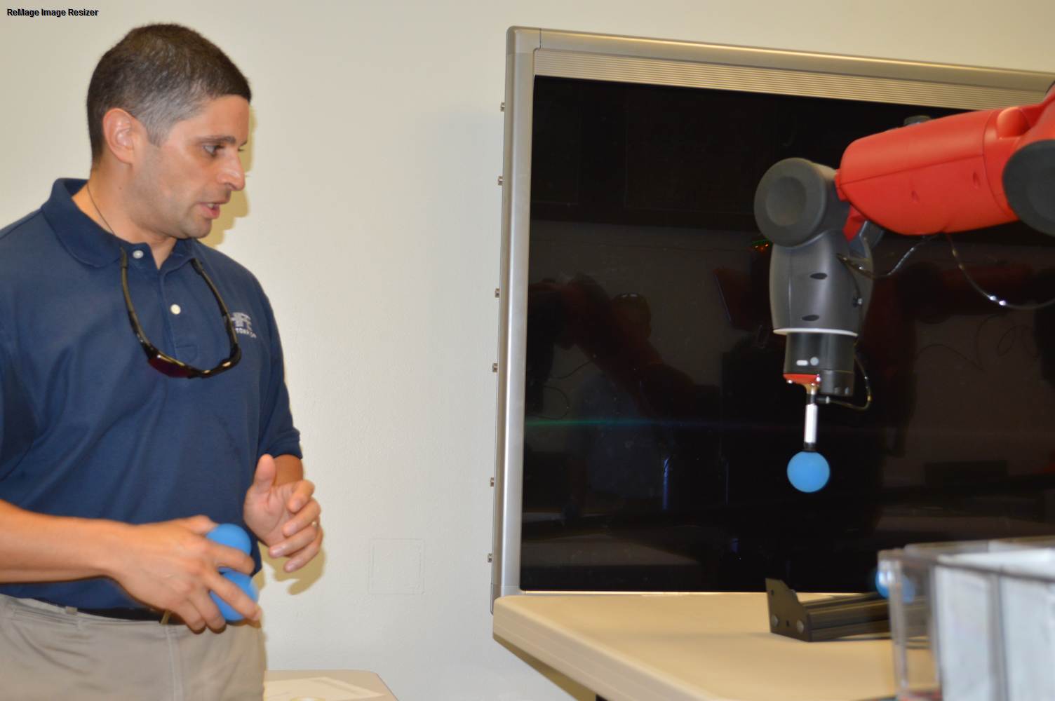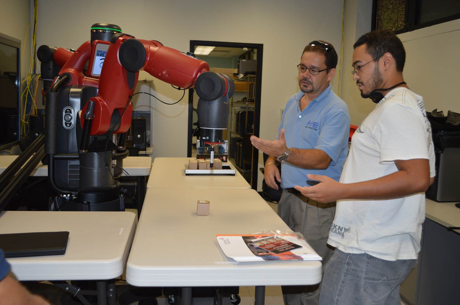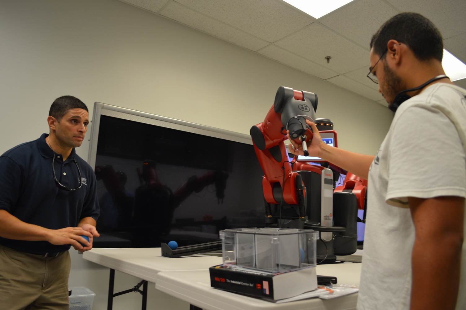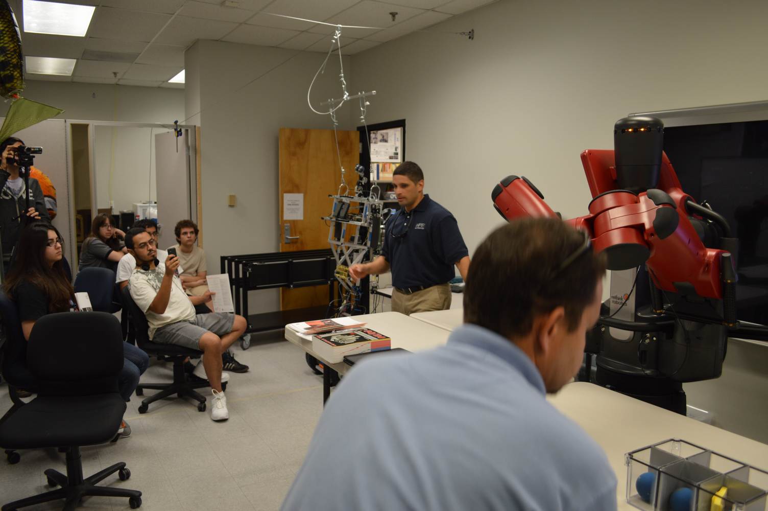 During last week, the Discovery Lab had a demonstration of Baxter, a robot by Rethink Robotics, meant to aid in industrial productions. The machine is a human sized robot, with two robotic arms with adaptable ends for different object sizes and shapes. It is incredibly easy to teach it new movements and has great versatility. Baxter has a ton of sensors for safety reasons that allow him to do things like sensing when a person is touching his arms and allow them to fully move them without resistance. He also has an ingenious interface where he nods or gives the user a confused look depending if he understood the commands or not. The Discovery Lab was considering to obtain one such machine for applications within the Telebot, but the end of that idea is still unclear. When all is placed into account, Baxter is a great improvement in the world of robotics.