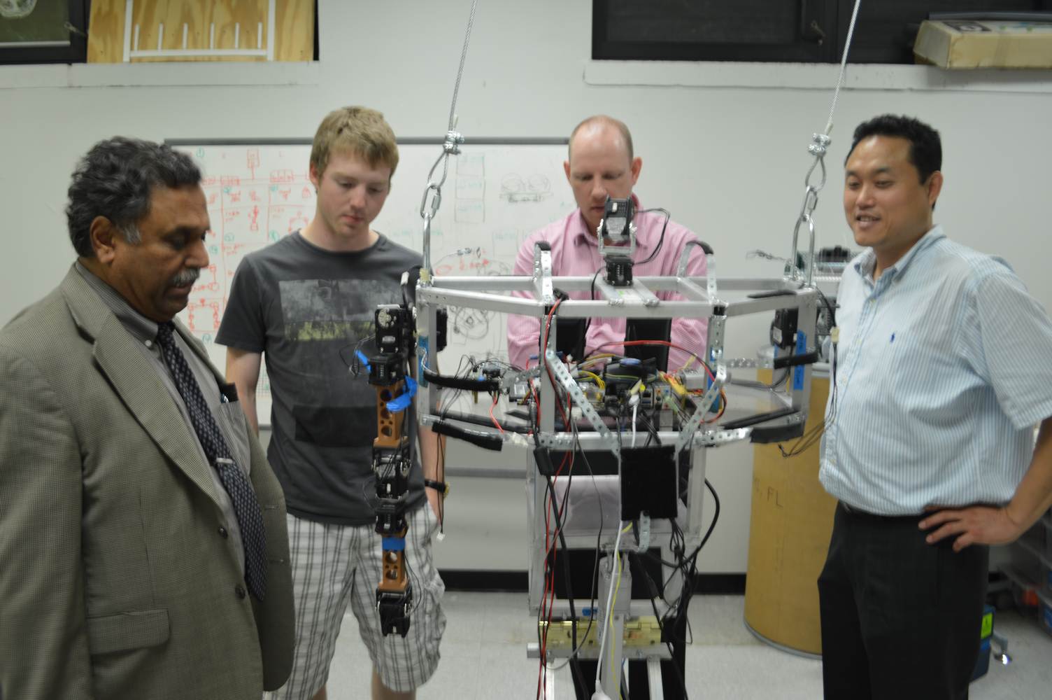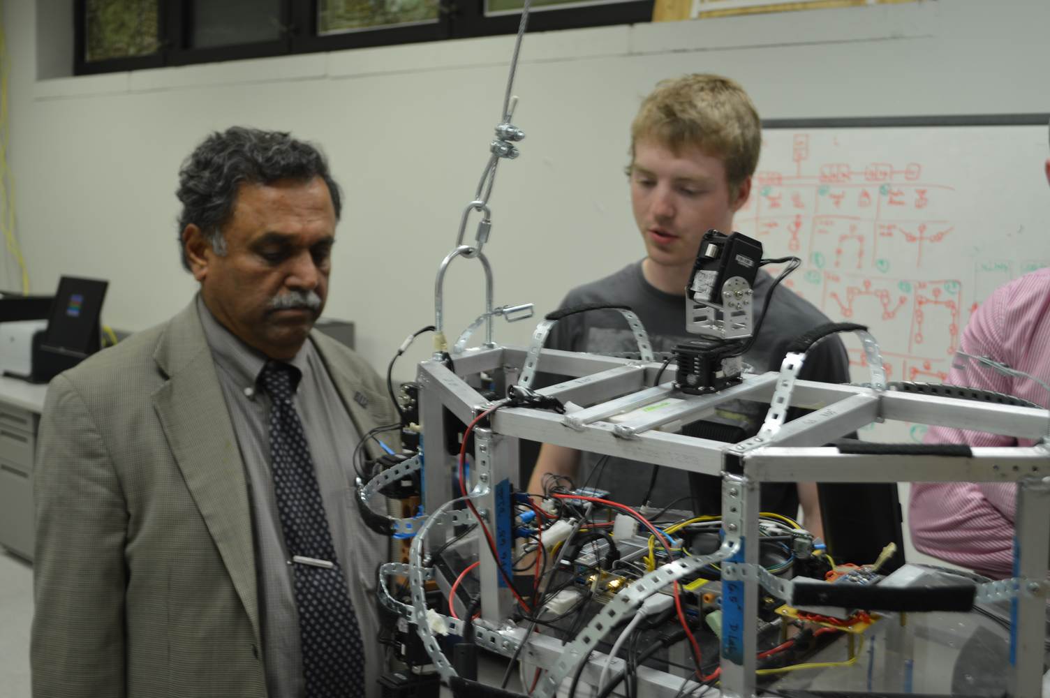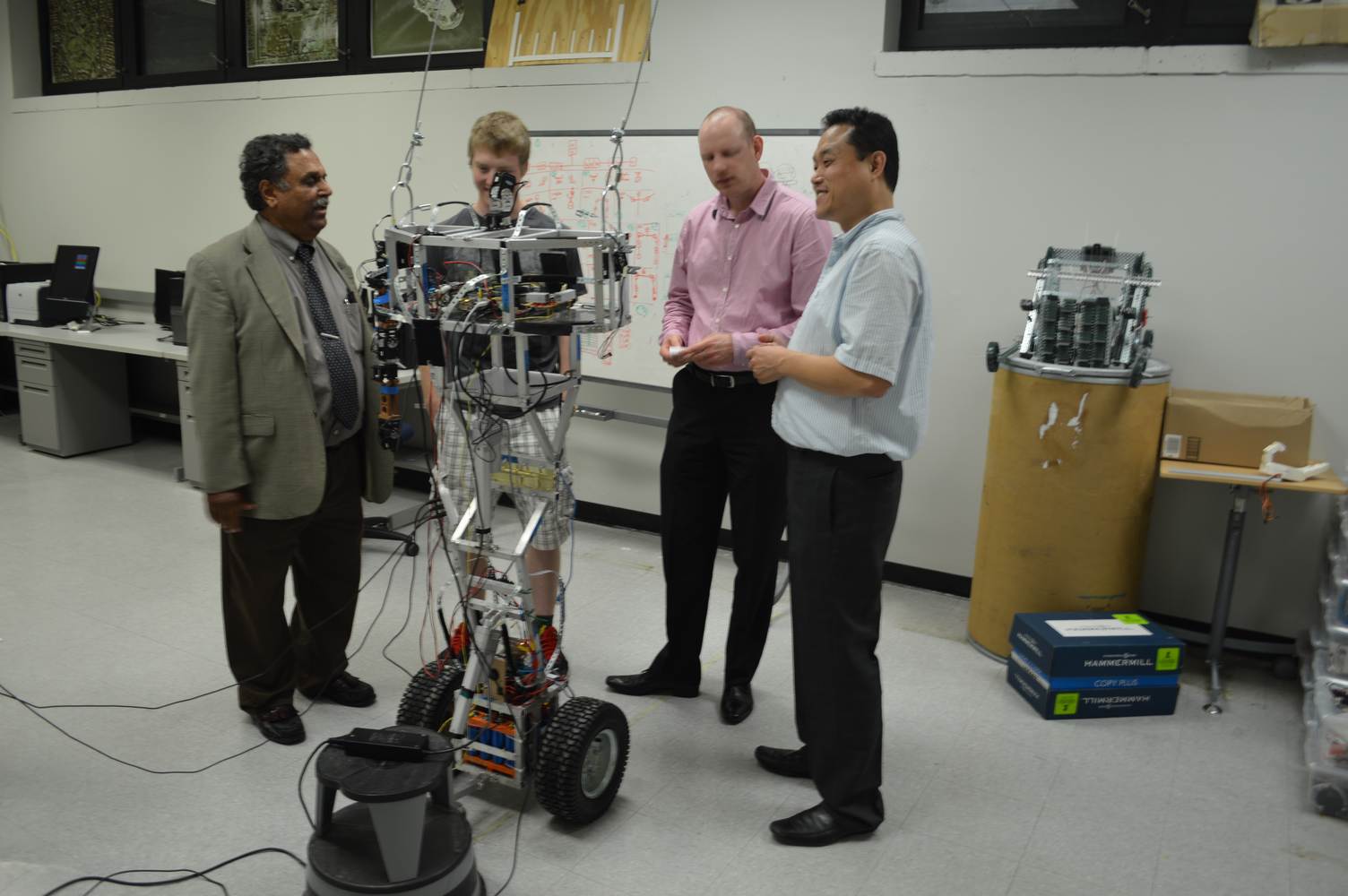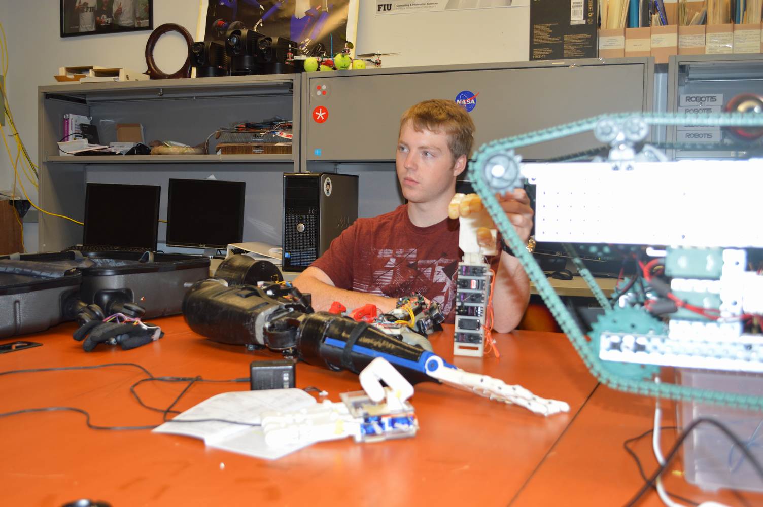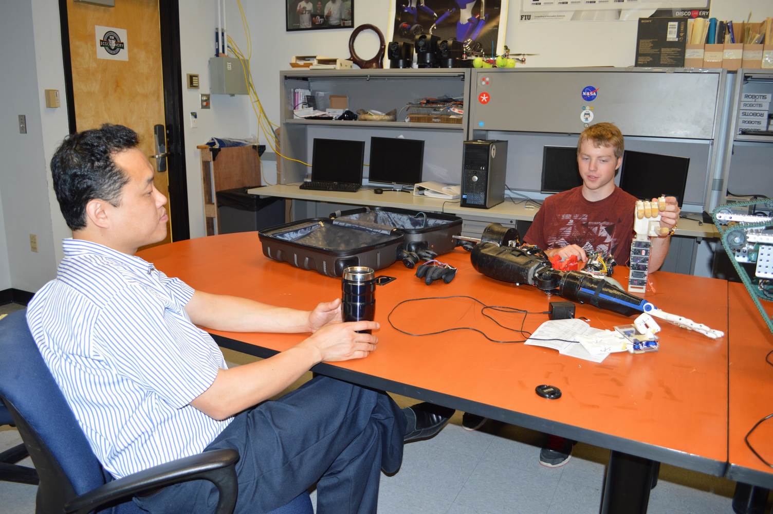 The Discovery Lab had the pleasure of having Easton LaChappelle working with us here at the lab for a week. Easton LaChappelle is a High School student from Colorado who has quite some experience in the field of animatronics. He had the opportunity to show his research to president Obama in the third annual White House Science Fair. His arm control designs are very ingenious and his understanding of robotics helped us further our own research. Easton had just returned from an internship at NASA when he came to the Discovery Lab. He had been working on the mechanical design of a teleoperated robotic arm, which is part of the work we do here at the Discovery Lab. Even after such a trip, he was amazed with our work on the Telebot, and was eager to help us. Althought short, his visit to the Discovery Lab gave us a different perspective on the idea of robotic Telepresence and provided us with inspiration for the future of the Telebot.