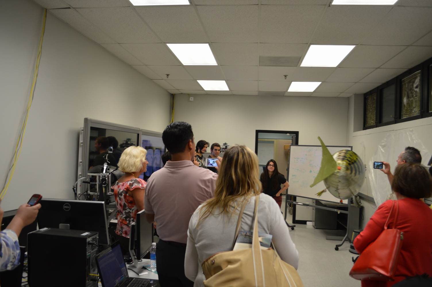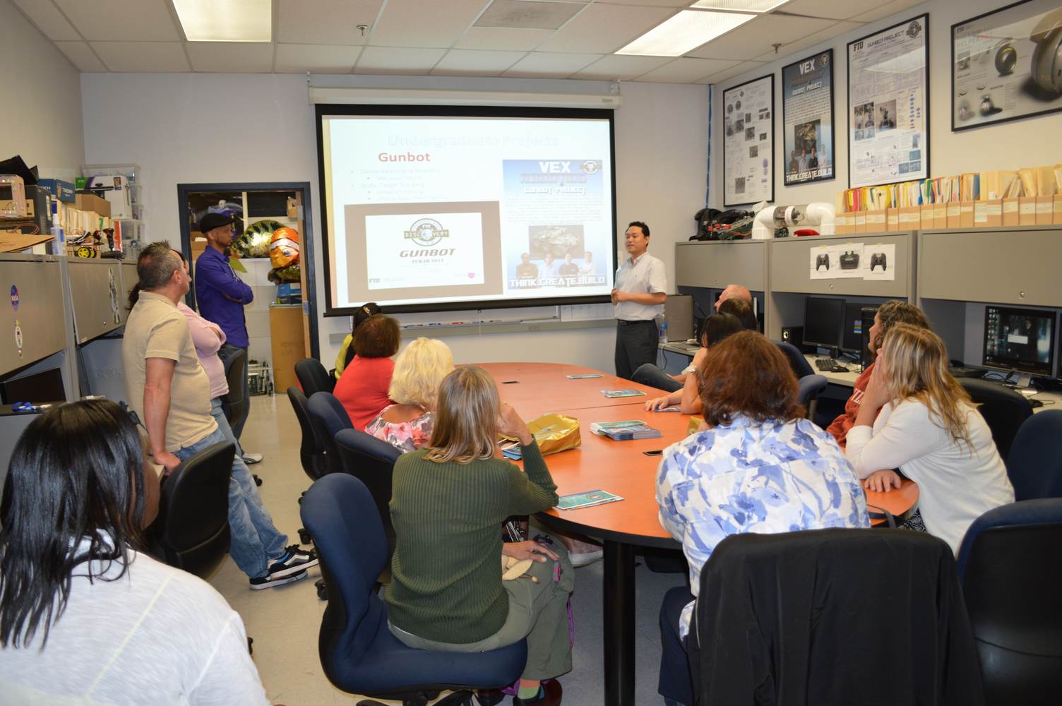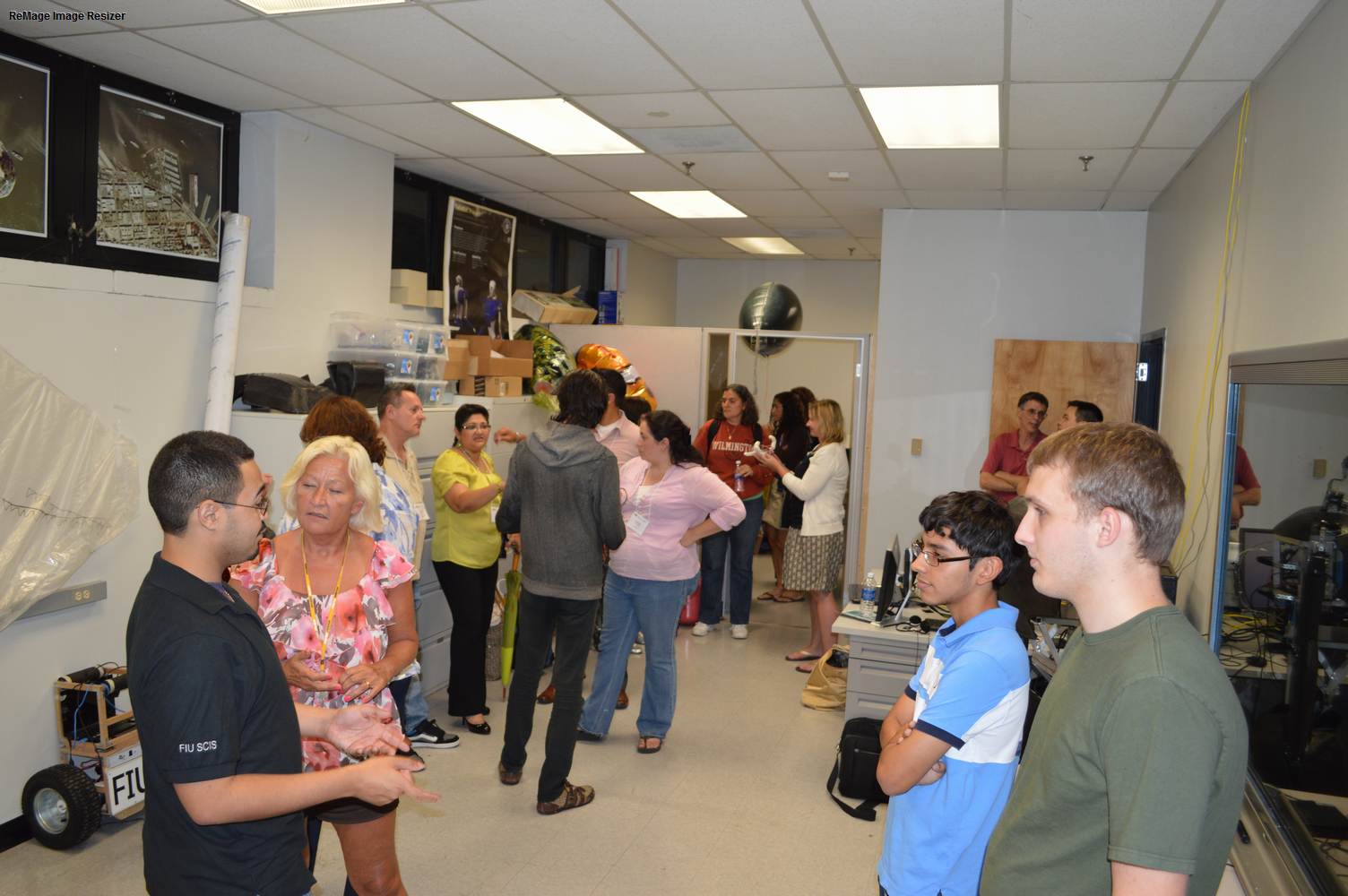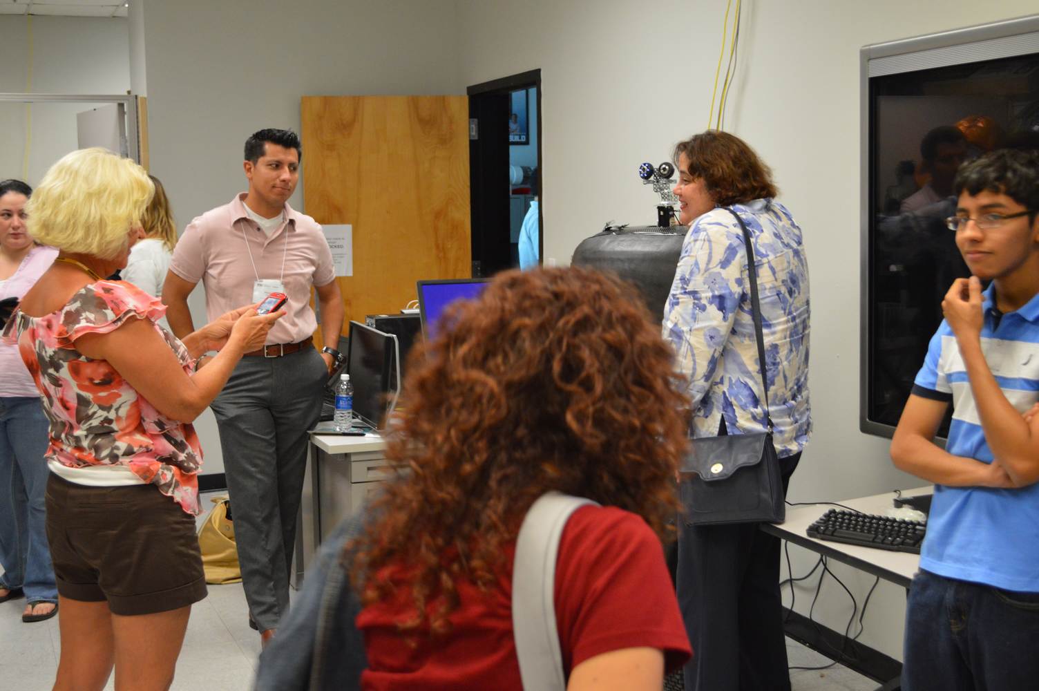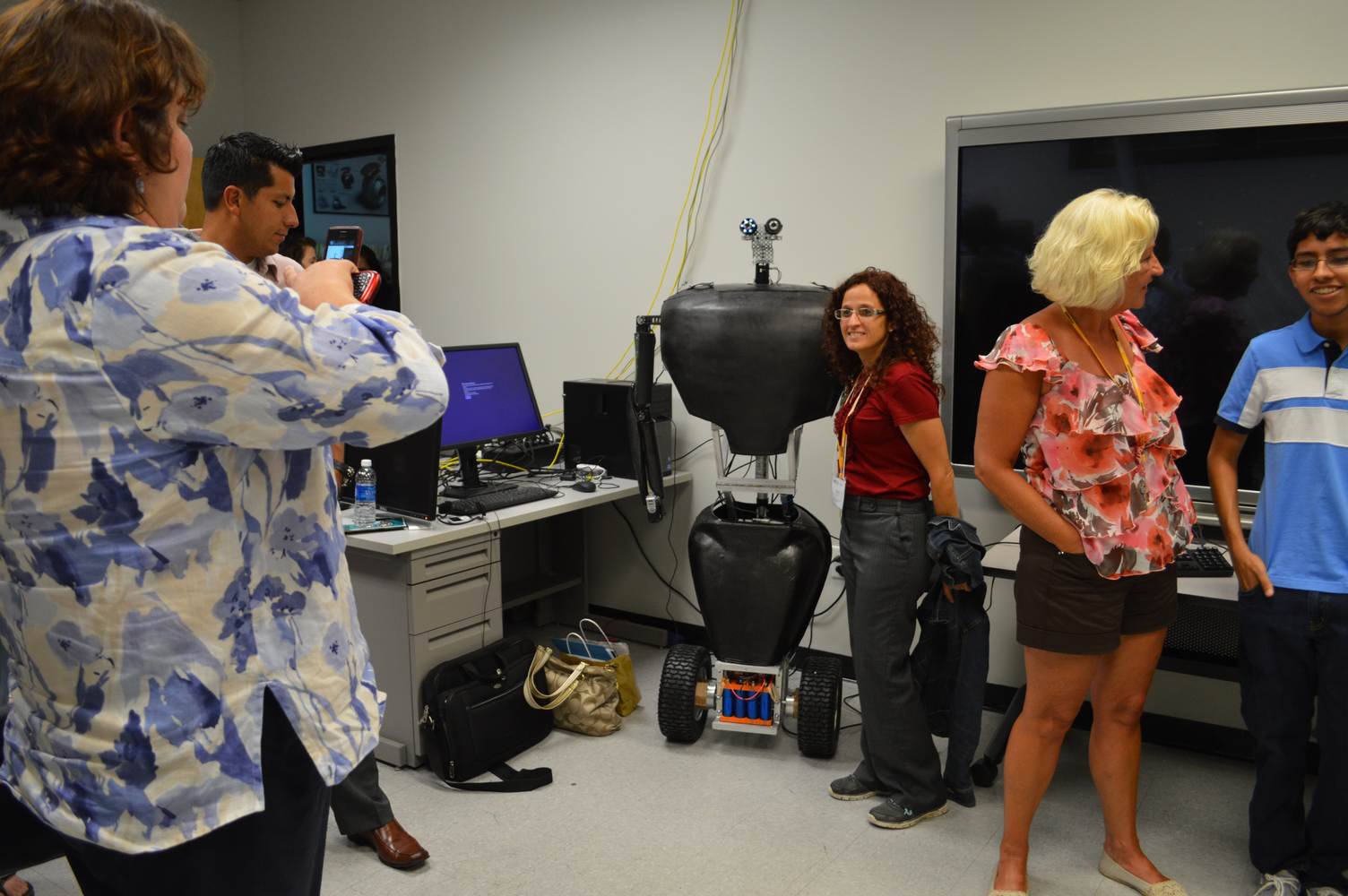 As part of the Tapestry Workshop hosted at FIU, the attendees received a tour of the Discovery Lab. The high school teachers were able to see a quick demonstration of some of the prototypes here as well as a full explanation of most of the projects. The participants recorded video of the machines and some even took pictures with the Telebot prototype. The atendees were most impressed with the air Aquarium project and the Telebot for their size and capabilities. Although it was a quick presentation, the participants were able to learn much about the Discovery Lab’s work here at FIU.