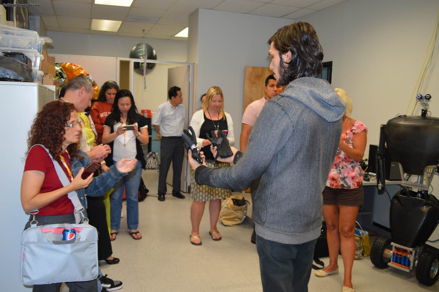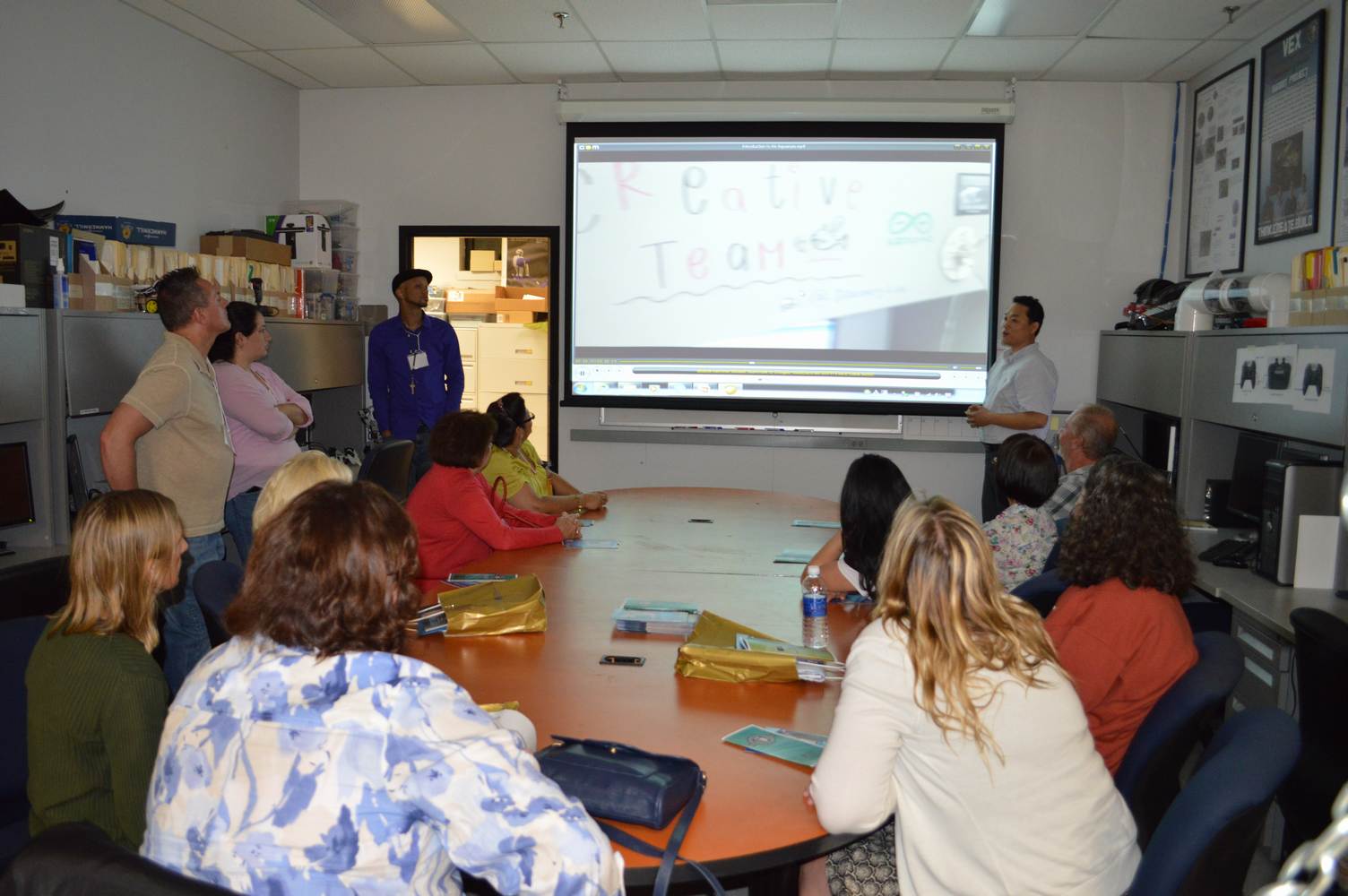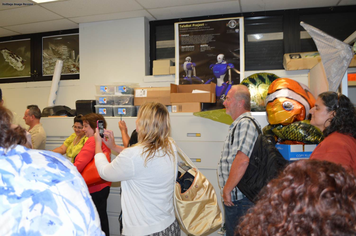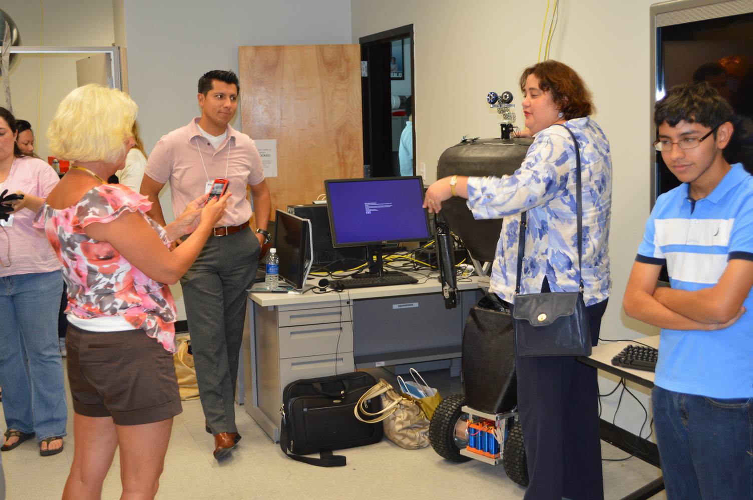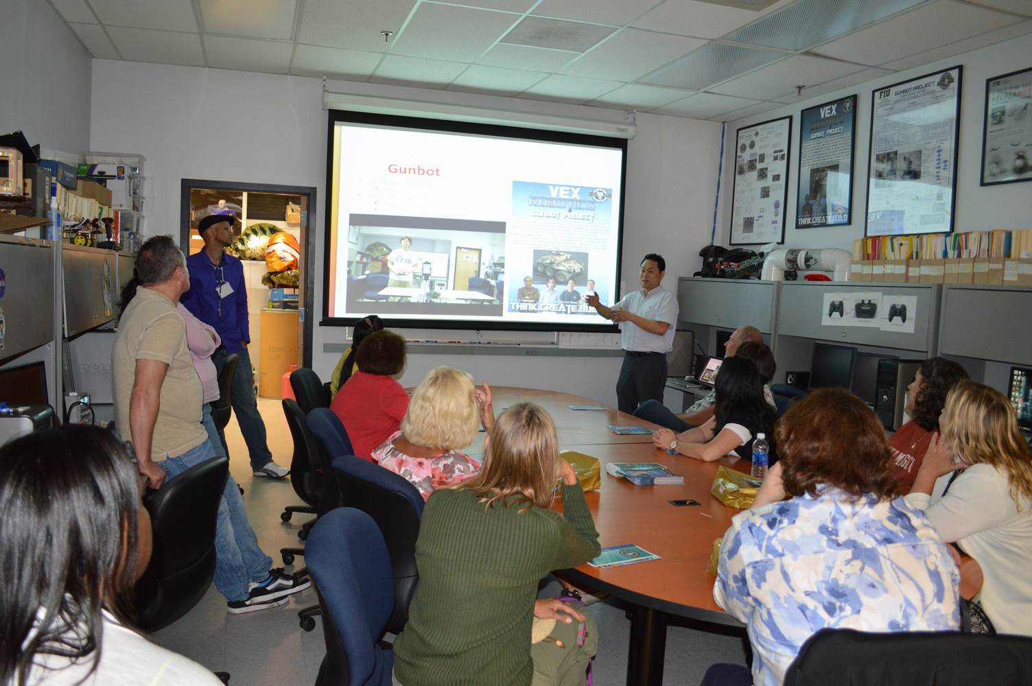 As part of the Tapestry Workshop hosted at FIU, the attendees received a tour of the Discovery Lab. The high school teachers were able to see a quick demonstration of some of the prototypes here as well as a full explanation of most of the projects. The participants recorded video of the machines and some even took pictures with the Telebot prototype. The atendees were most impressed with the air Aquarium project and the Telebot for their size and capabilities. Although it was a quick presentation, the participants were able to learn much about the Discovery Lab’s work here at FIU.