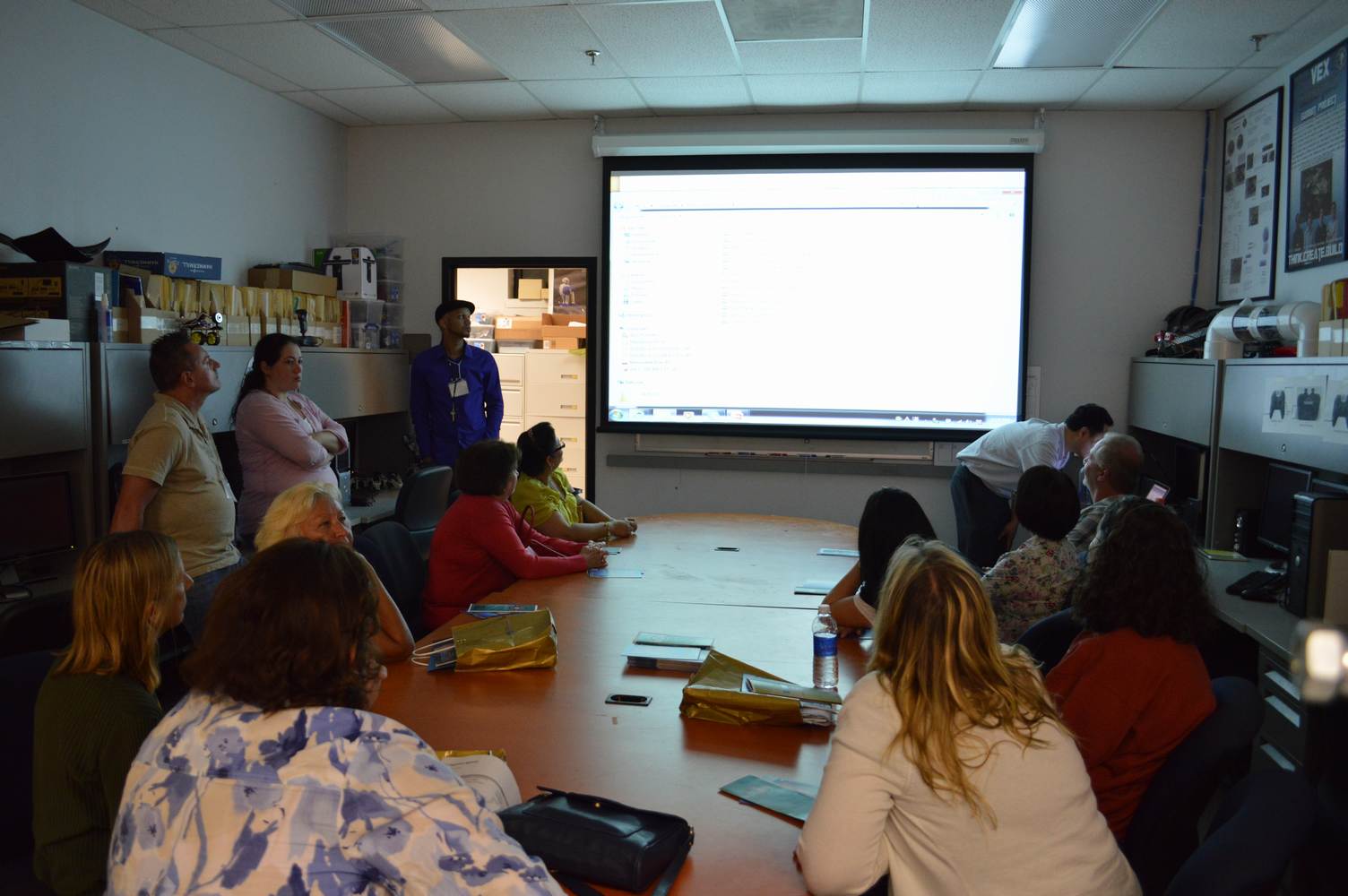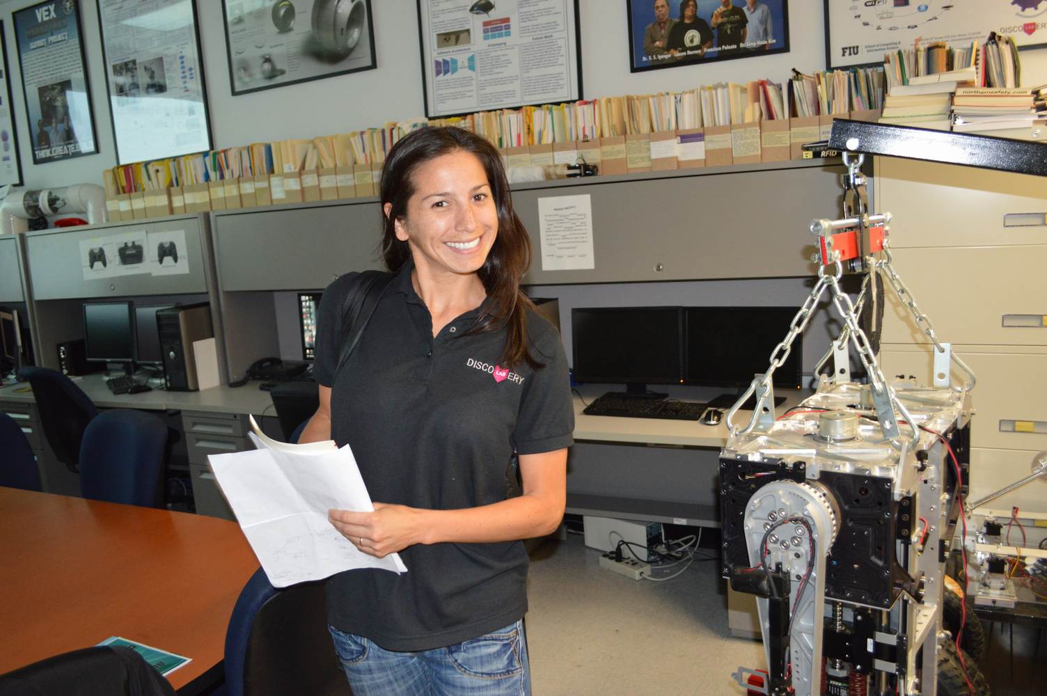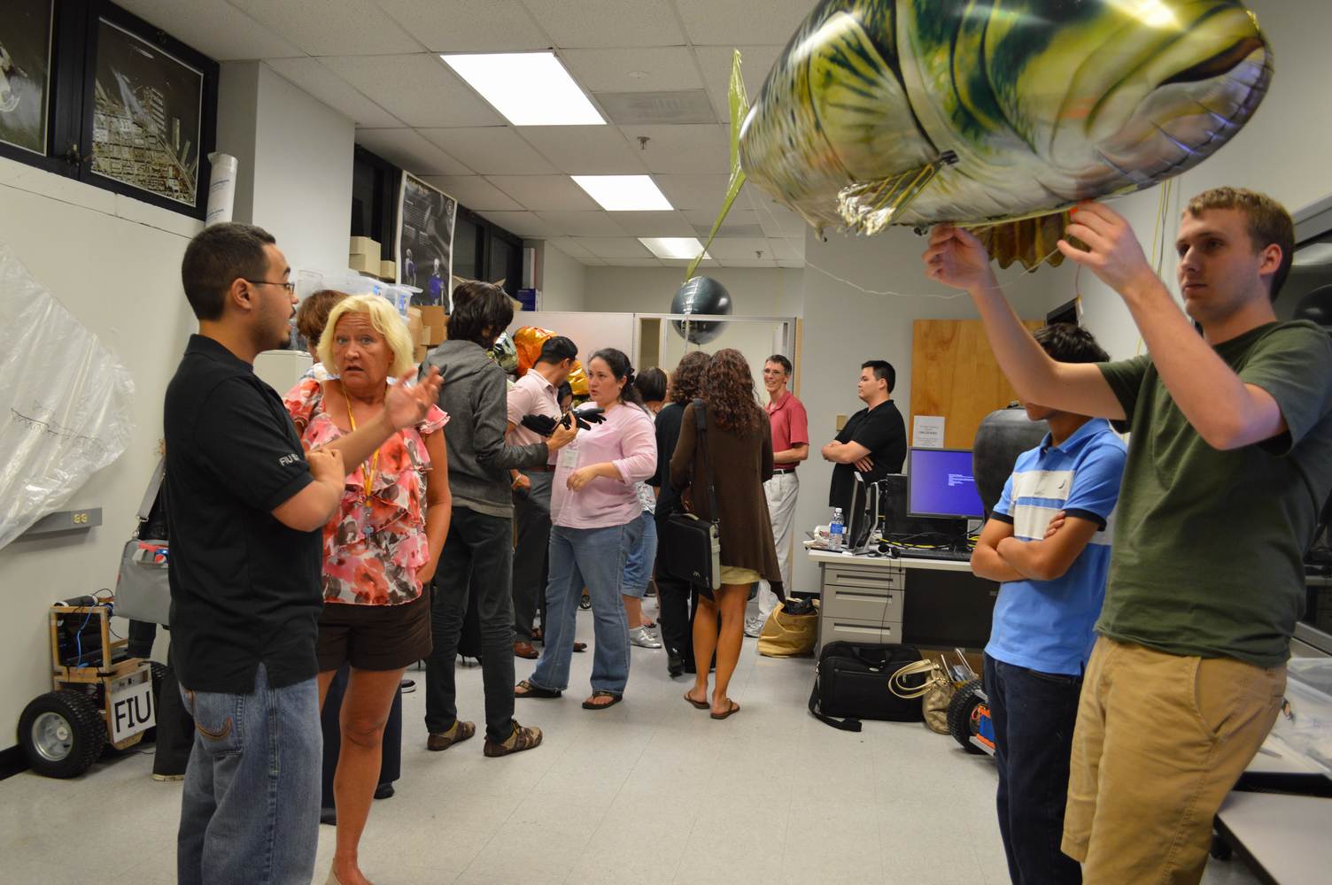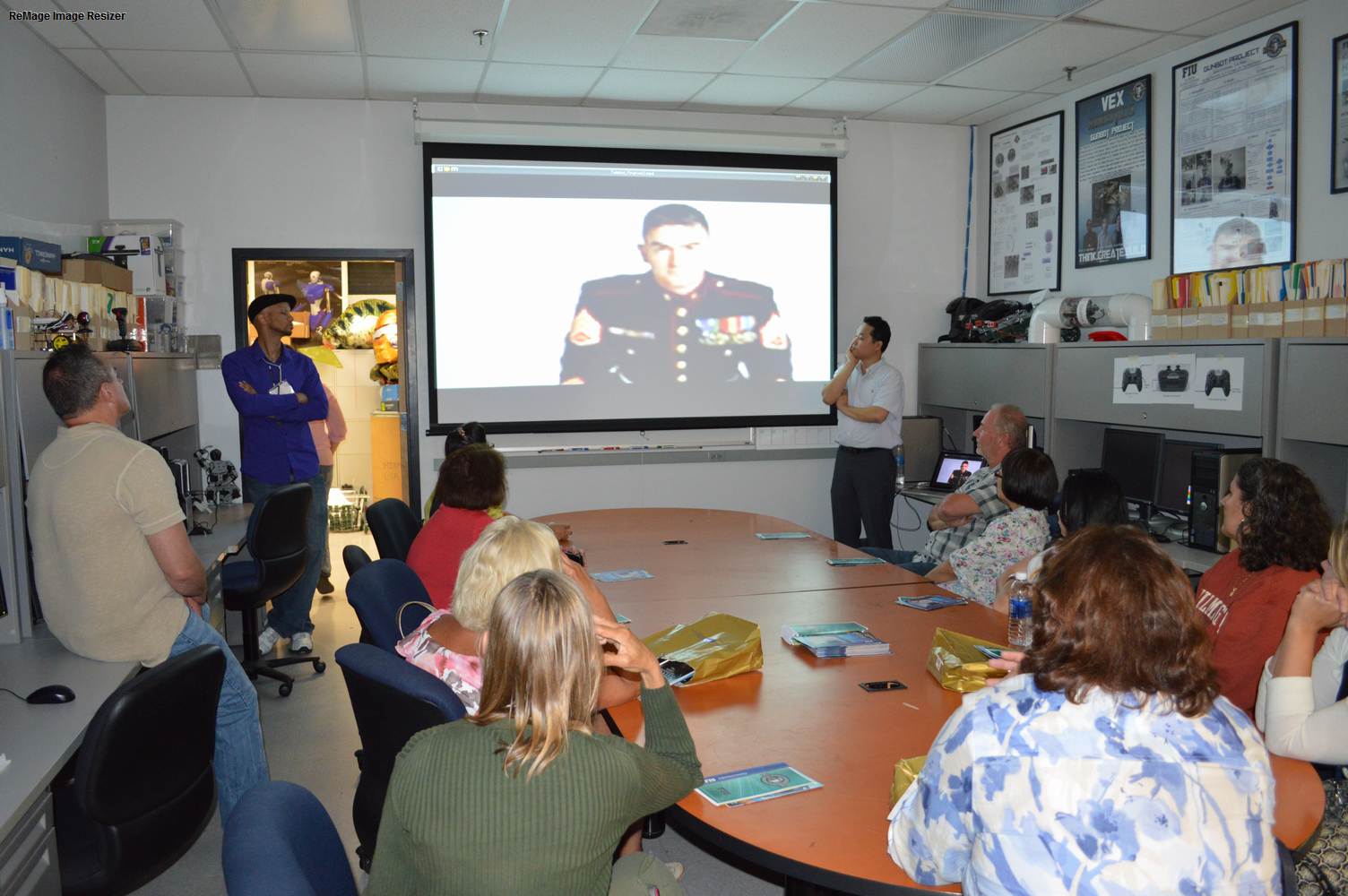As part of the Tapestry Workshop hosted at FIU, the attendees received a tour of the Discovery Lab. The high school teachers were able to see a quick demonstration of some of the prototypes here as well as a full explanation of most of the projects. The participants recorded video of the machines and some even took pictures with the Telebot prototype. The atendees were most impressed with the air Aquarium project and the Telebot for their size and capabilities. Although it was a quick presentation, the participants were able to learn much about the Discovery Lab’s work here at FIU.