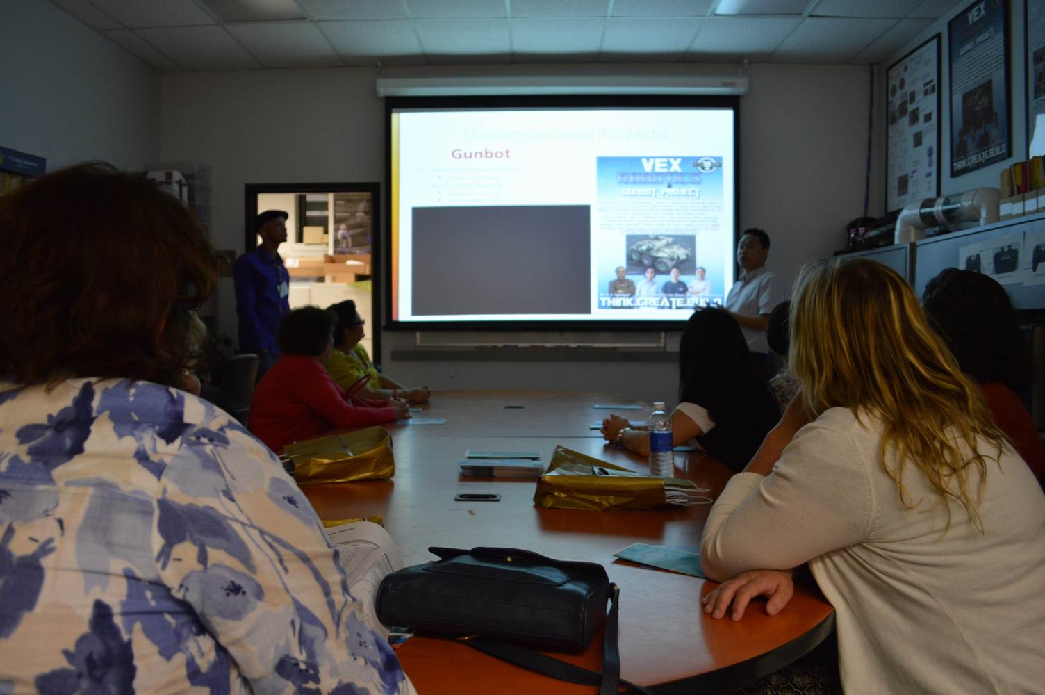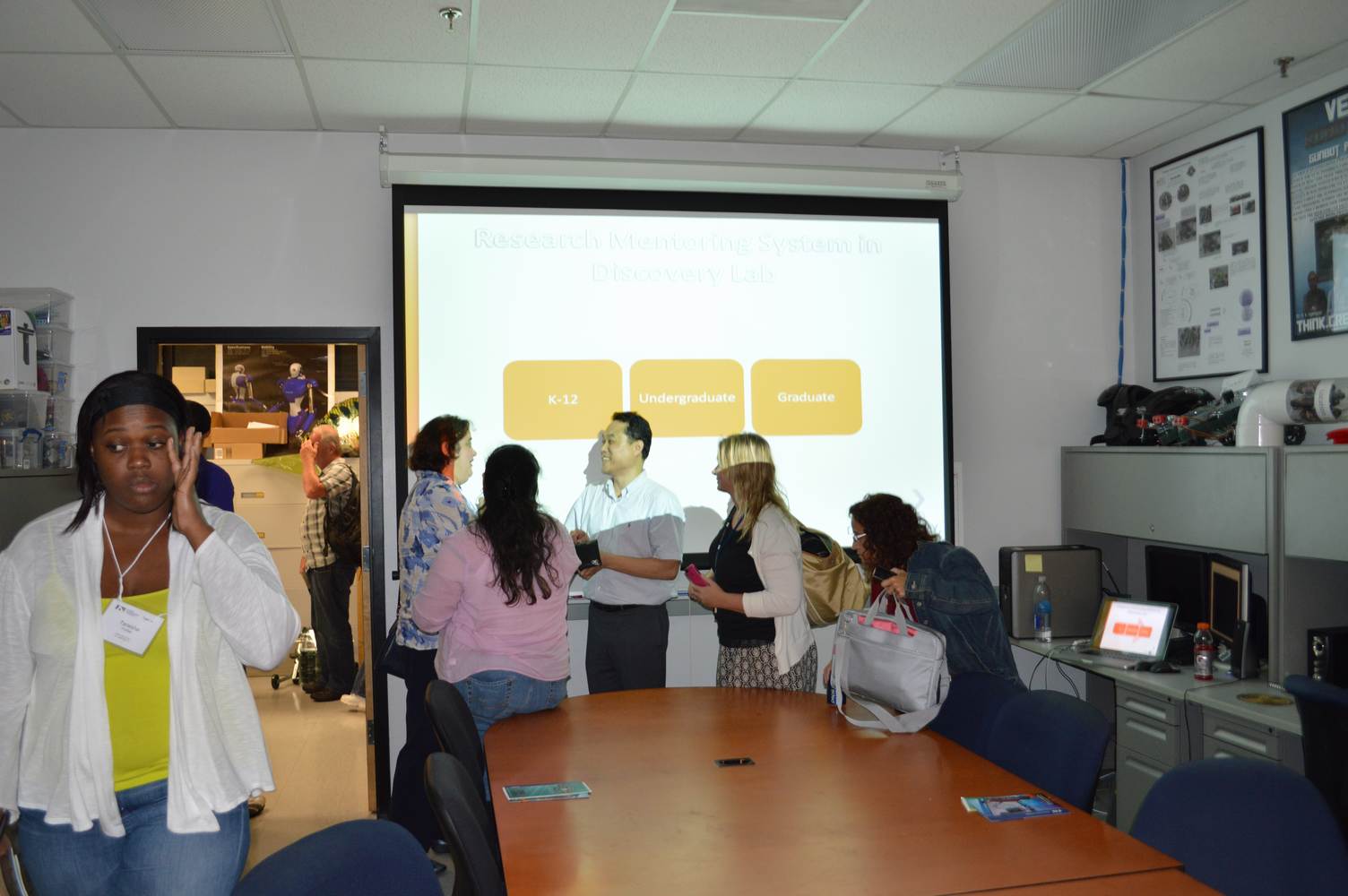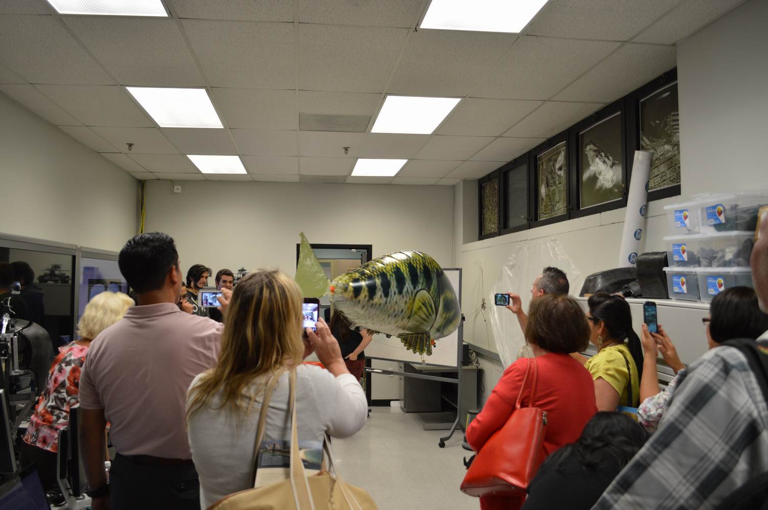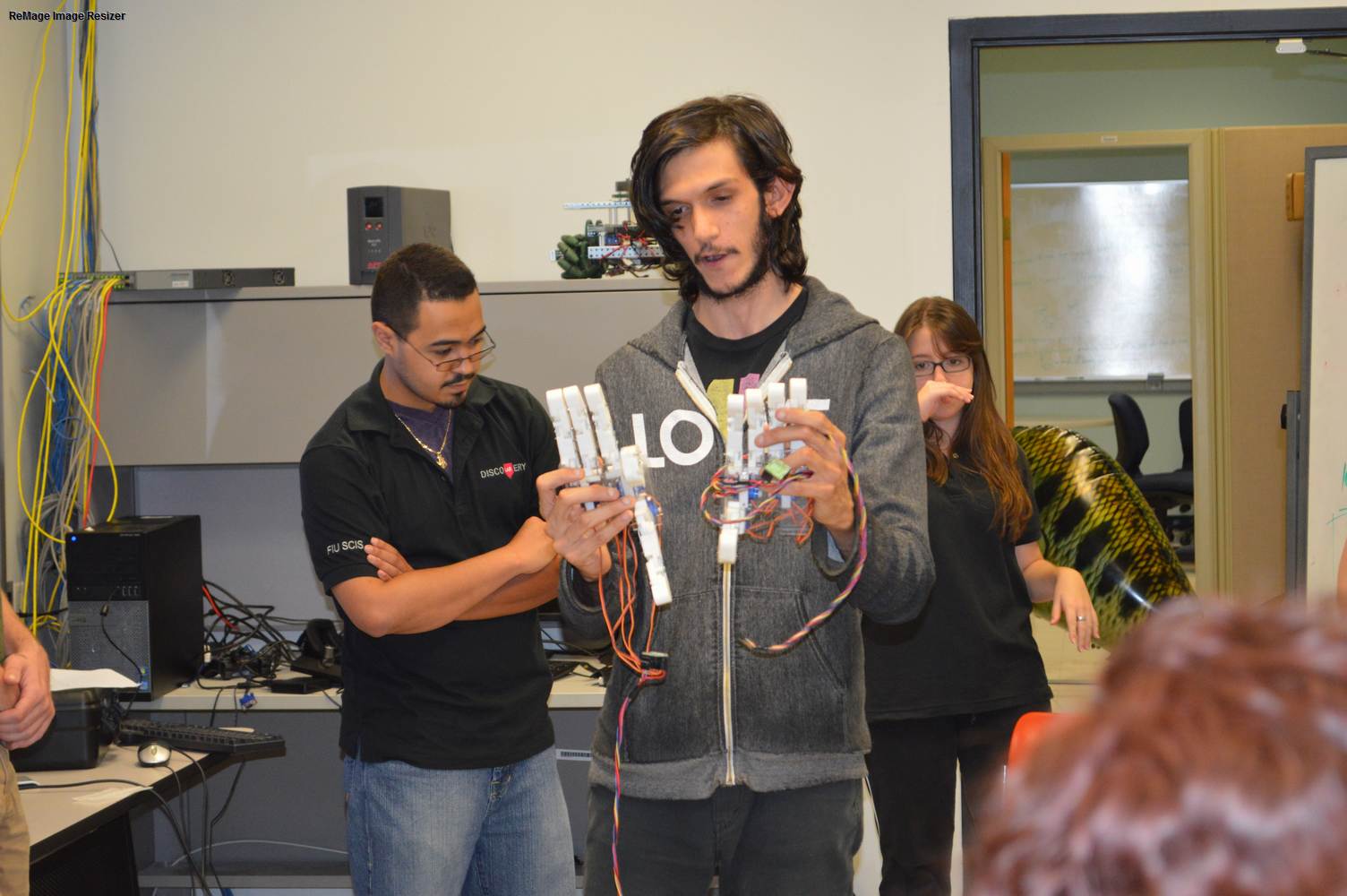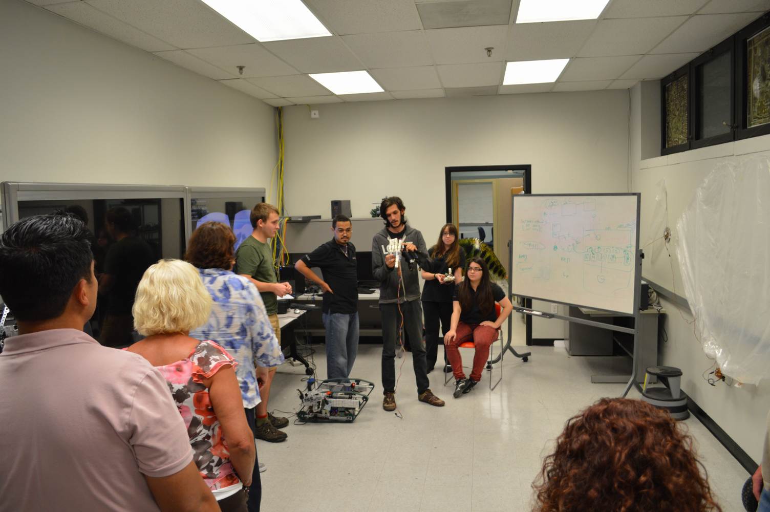 As part of the Tapestry Workshop hosted at FIU, the attendees received a tour of the Discovery Lab. The high school teachers were able to see a quick demonstration of some of the prototypes here as well as a full explanation of most of the projects. The participants recorded video of the machines and some even took pictures with the Telebot prototype. The atendees were most impressed with the air Aquarium project and the Telebot for their size and capabilities. Although it was a quick presentation, the participants were able to learn much about the Discovery Lab’s work here at FIU.