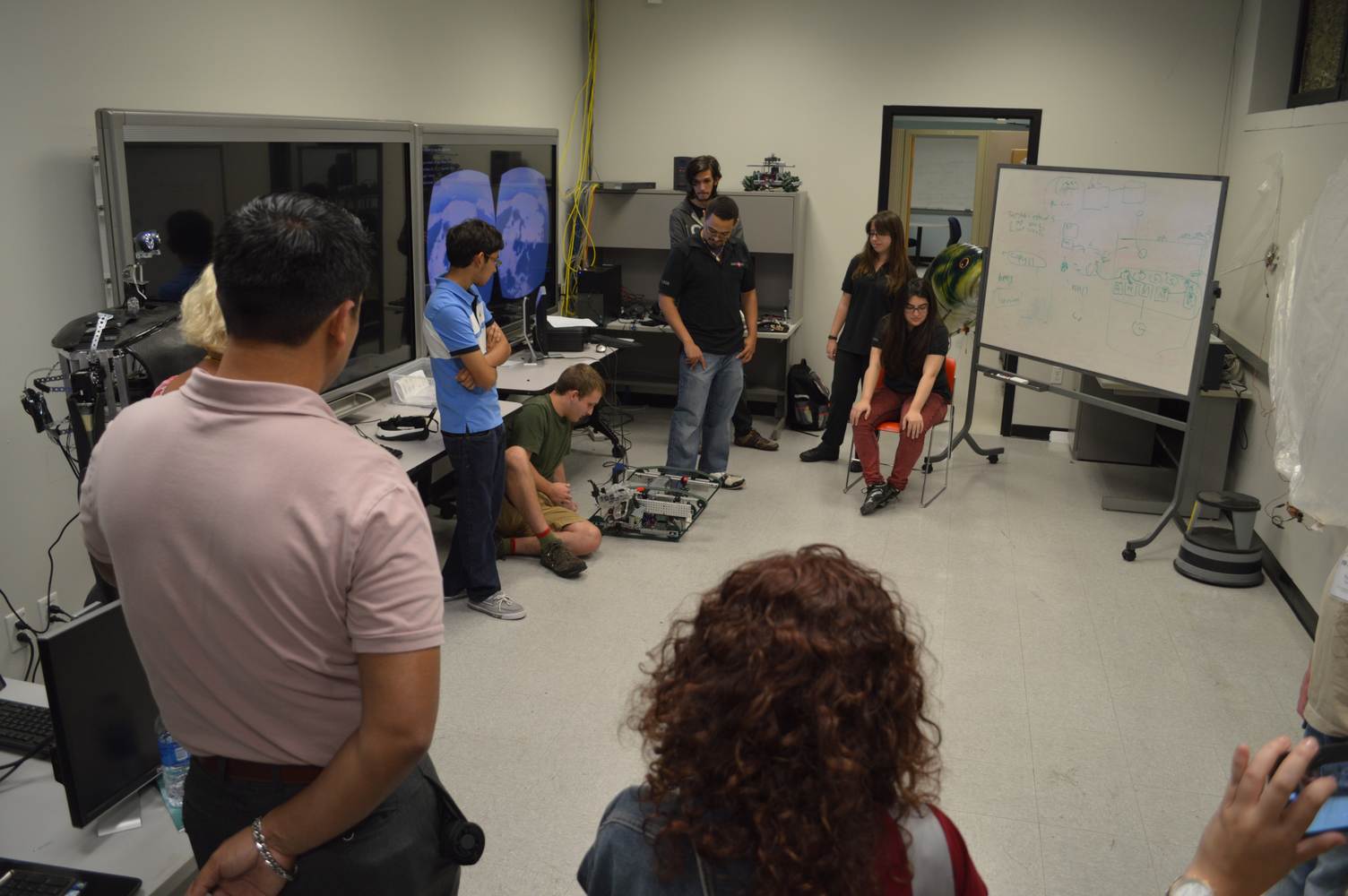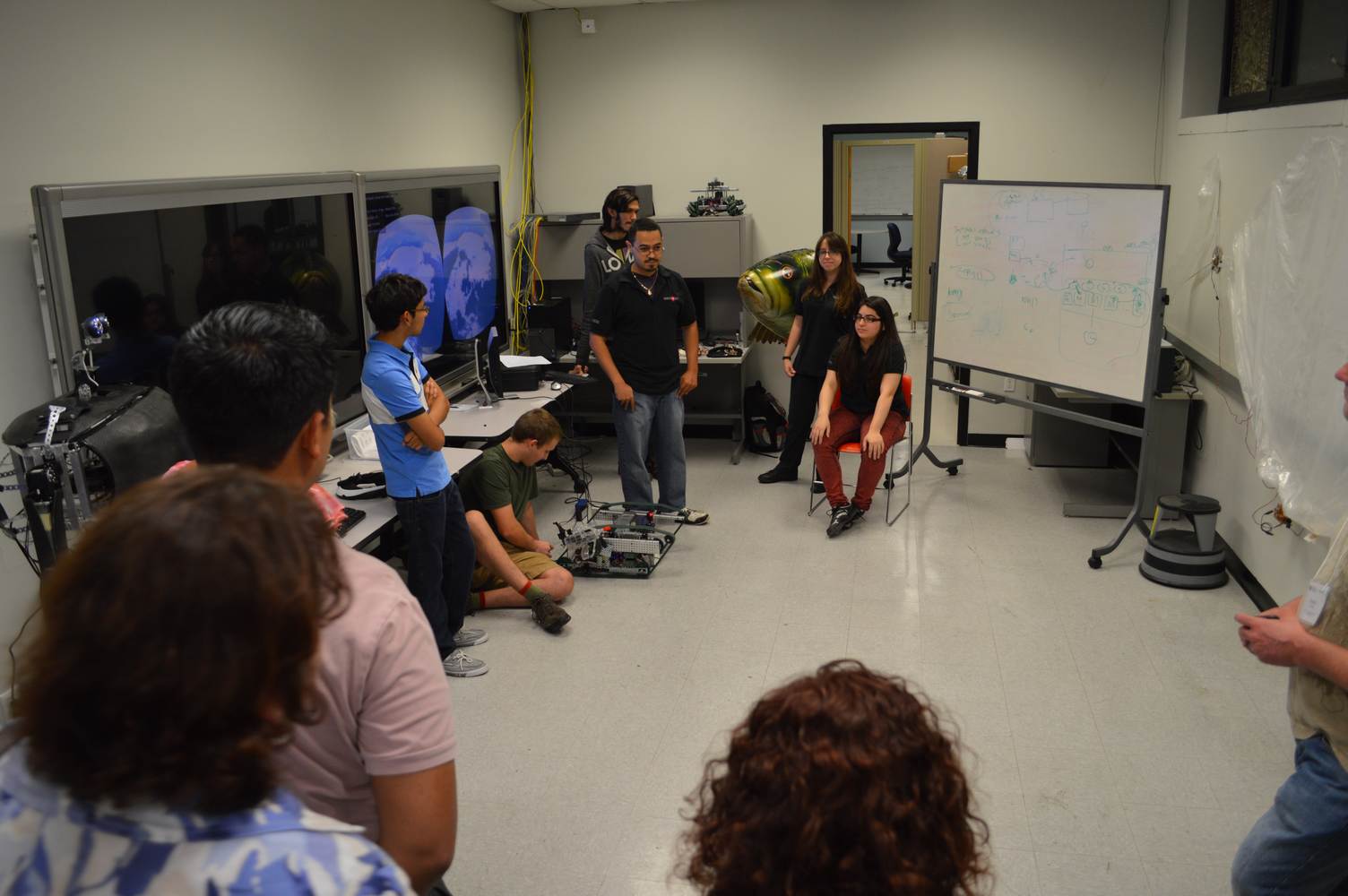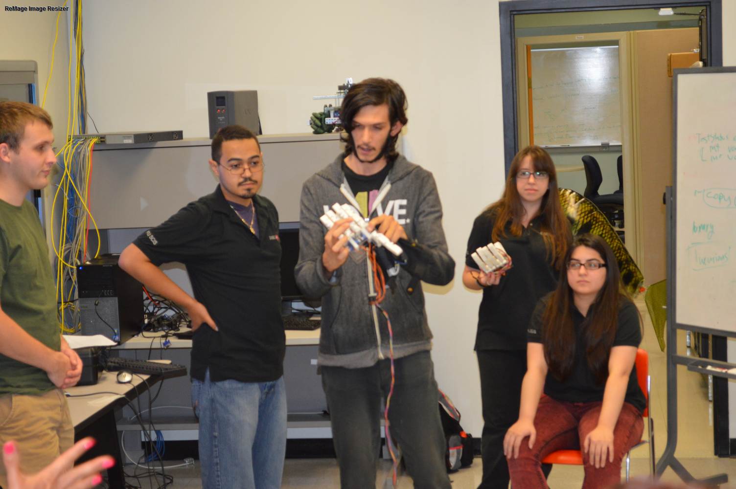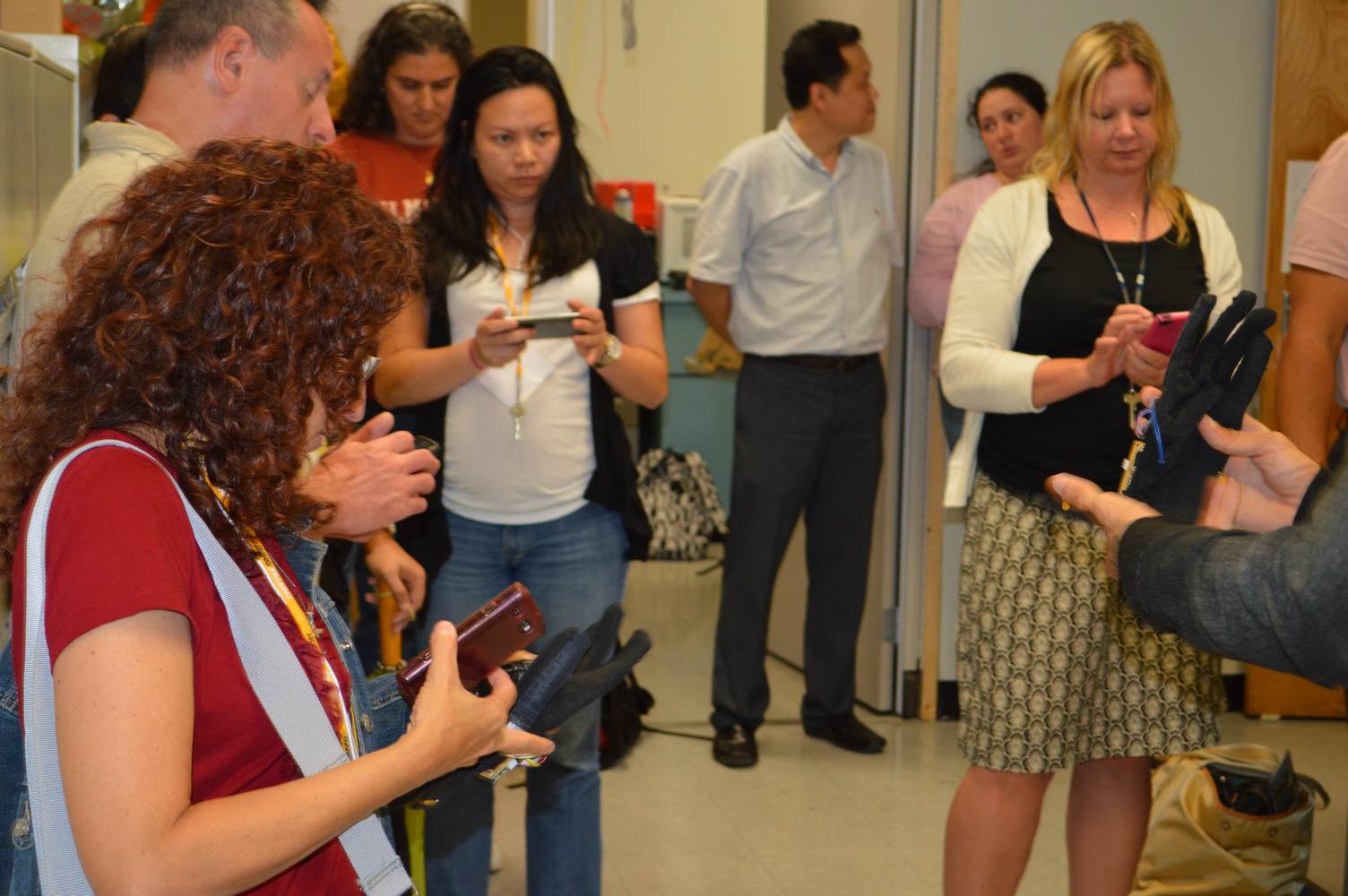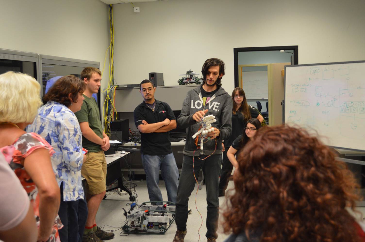 As part of the Tapestry Workshop hosted at FIU, the attendees received a tour of the Discovery Lab. The high school teachers were able to see a quick demonstration of some of the prototypes here as well as a full explanation of most of the projects. The participants recorded video of the machines and some even took pictures with the Telebot prototype. The atendees were most impressed with the air Aquarium project and the Telebot for their size and capabilities. Although it was a quick presentation, the participants were able to learn much about the Discovery Lab’s work here at FIU.