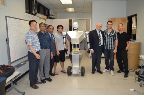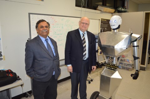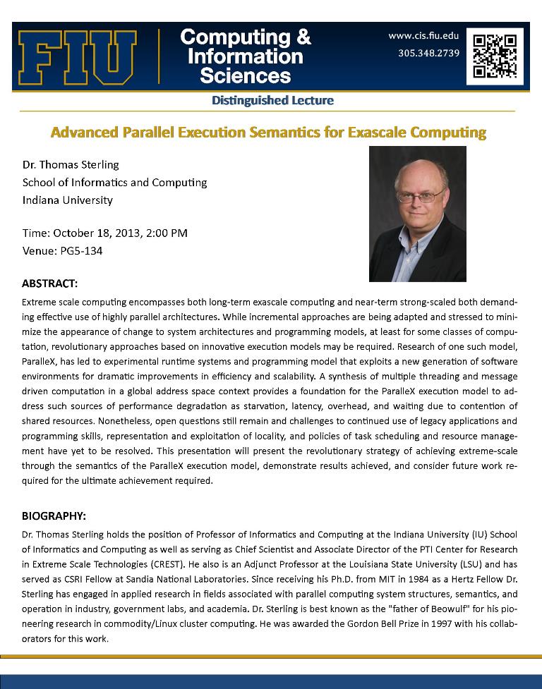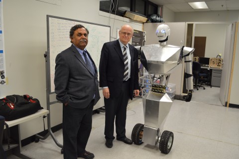 On the Morning of October 18, the Discovery Lab had the pleasure of demonstrating our main project, the Telebot, to Dr Thomas Sterling. Dr Sterling is a PhD graduate from MIT and is the current Executive Associate Director and Chief Scientis of CREST at IU. Dr Sterling’s many accomplishments include “Arnaud and Edwards Endowed Professor”,”Hertz Foundation Fellowship” (1980) and “Gordon Bell Prize for Price Performance” (1997). He came to FIU to give a talk on Advanced Parallel Execution Semantics for Exascale Computing and took a few minutes to visit the Discovery Lab. Dr Sterling was very impressed with the possible applications of the Telebot on the field, as well as with the feat of creating such a system on its own. He mentioned his interest in following the project’s development on its later stages. We hope to be able to meet him later on to update him on our progress.